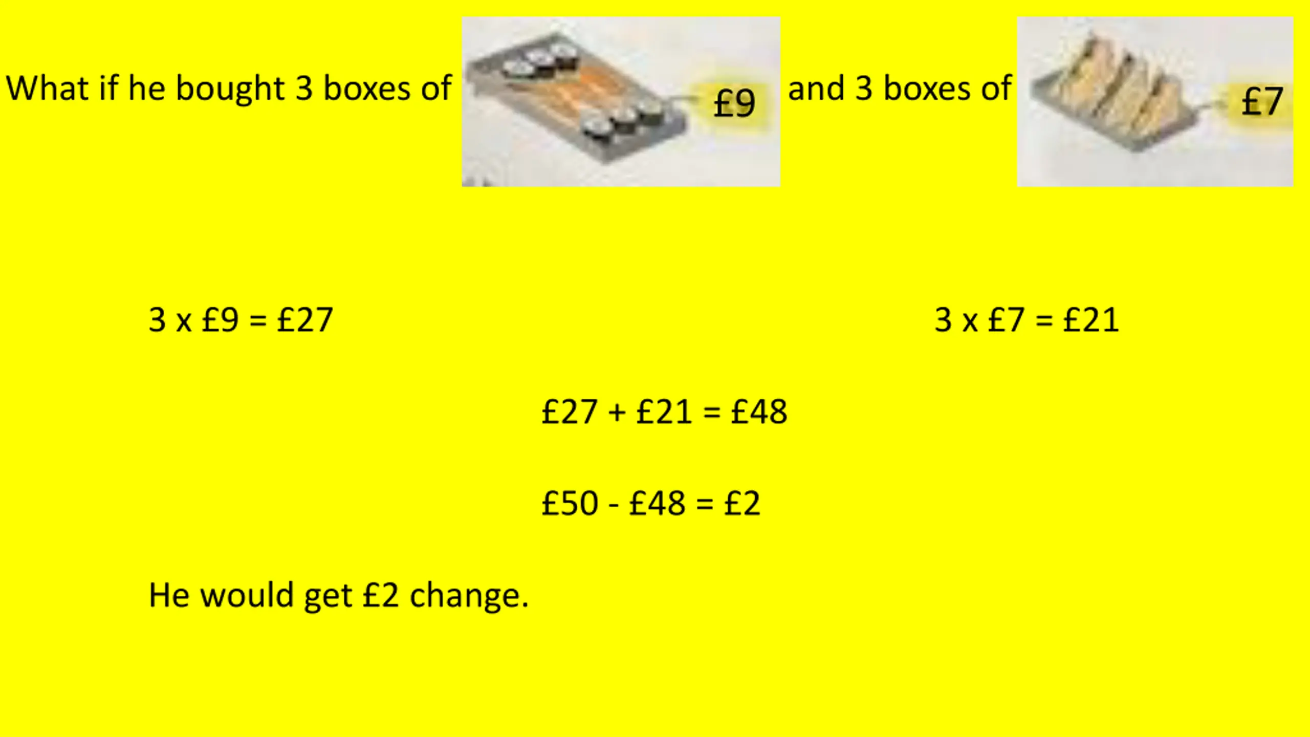 What if he bought 3 boxes of and 3 boxes of 7 9 3 x 9 = 27 3 x 7 = 21 27 + 21 = 48 50 - 48 = 2 He would get 2 change.
