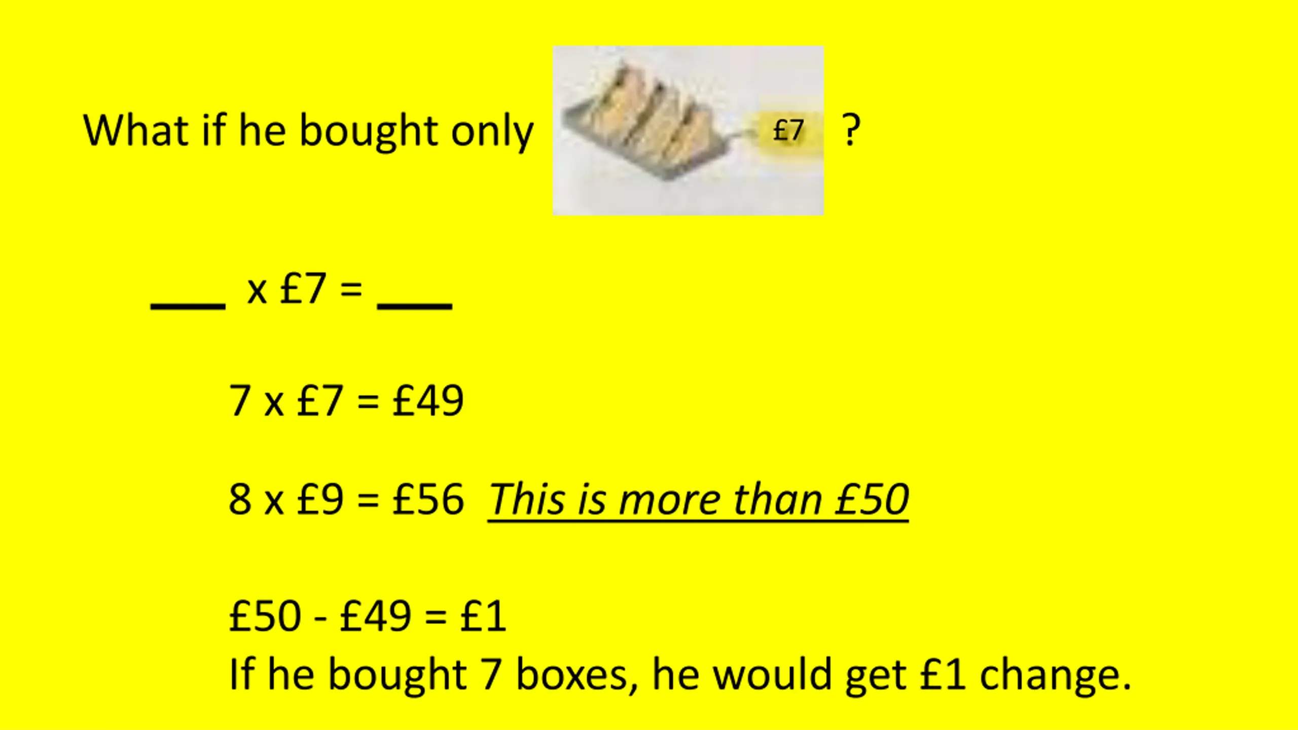 What if he bought only ? 7 x 7 = 7 x 7 = 49 8 x 9 = 56 This is more than 50 50 - 49 = 1 If he bought 7 boxes, he would get 1 change.