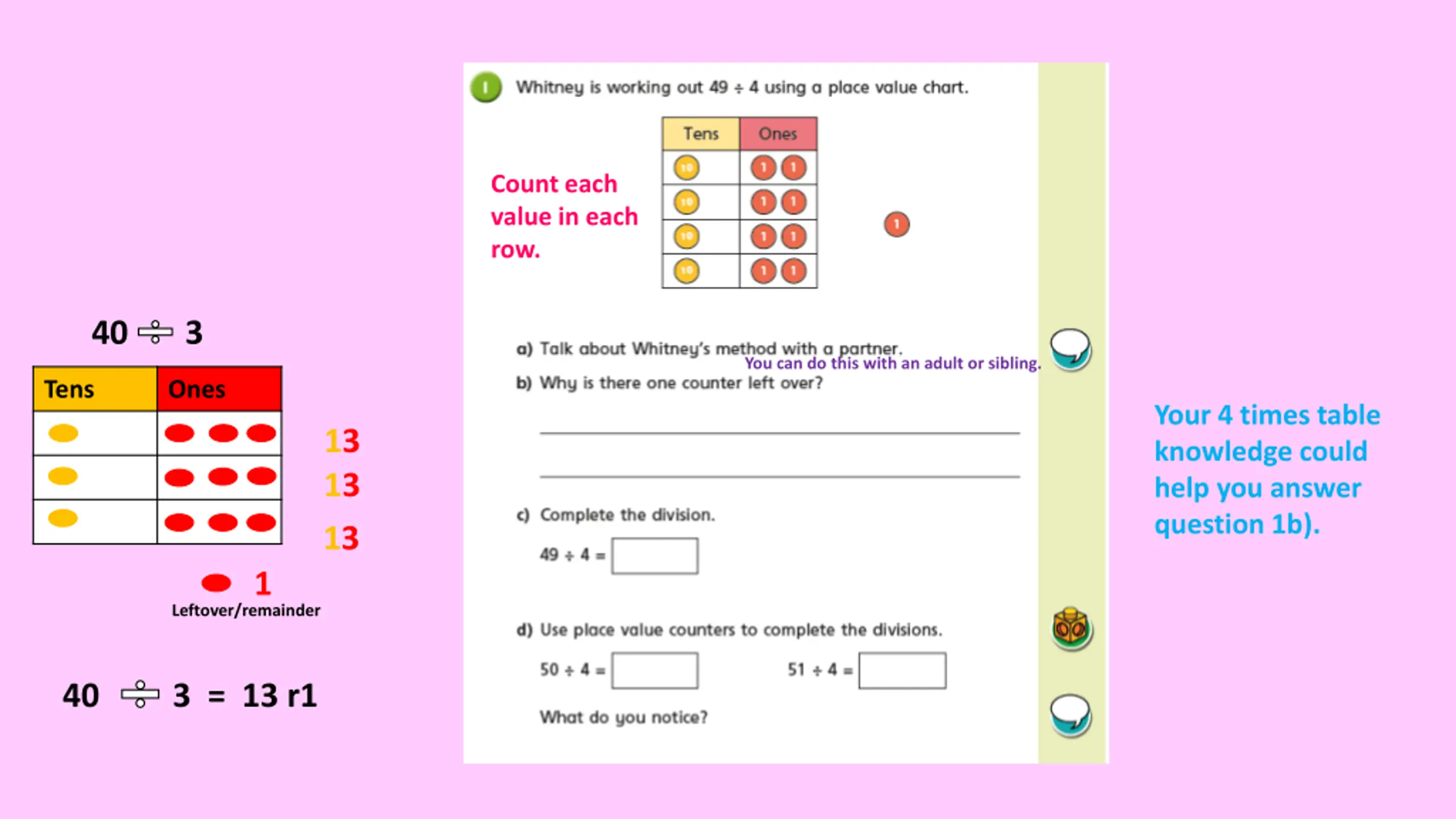Count each value in each row. 40 3 You can do this with an adult or sibling. Tens Ones Your 4 times table knowledge could help you answer question 1b). 13 13 13 1 Leftover/remainder 40 3 = 13 r1