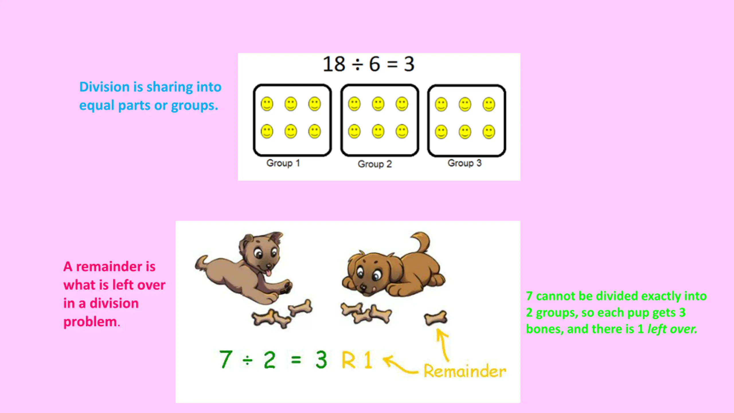 Division is sharing into equal parts or groups. A remainder is what is left over in a division problem. 7 cannot be divided exactly into 2 groups, so each pup gets 3 bones, and there is 1 left over.