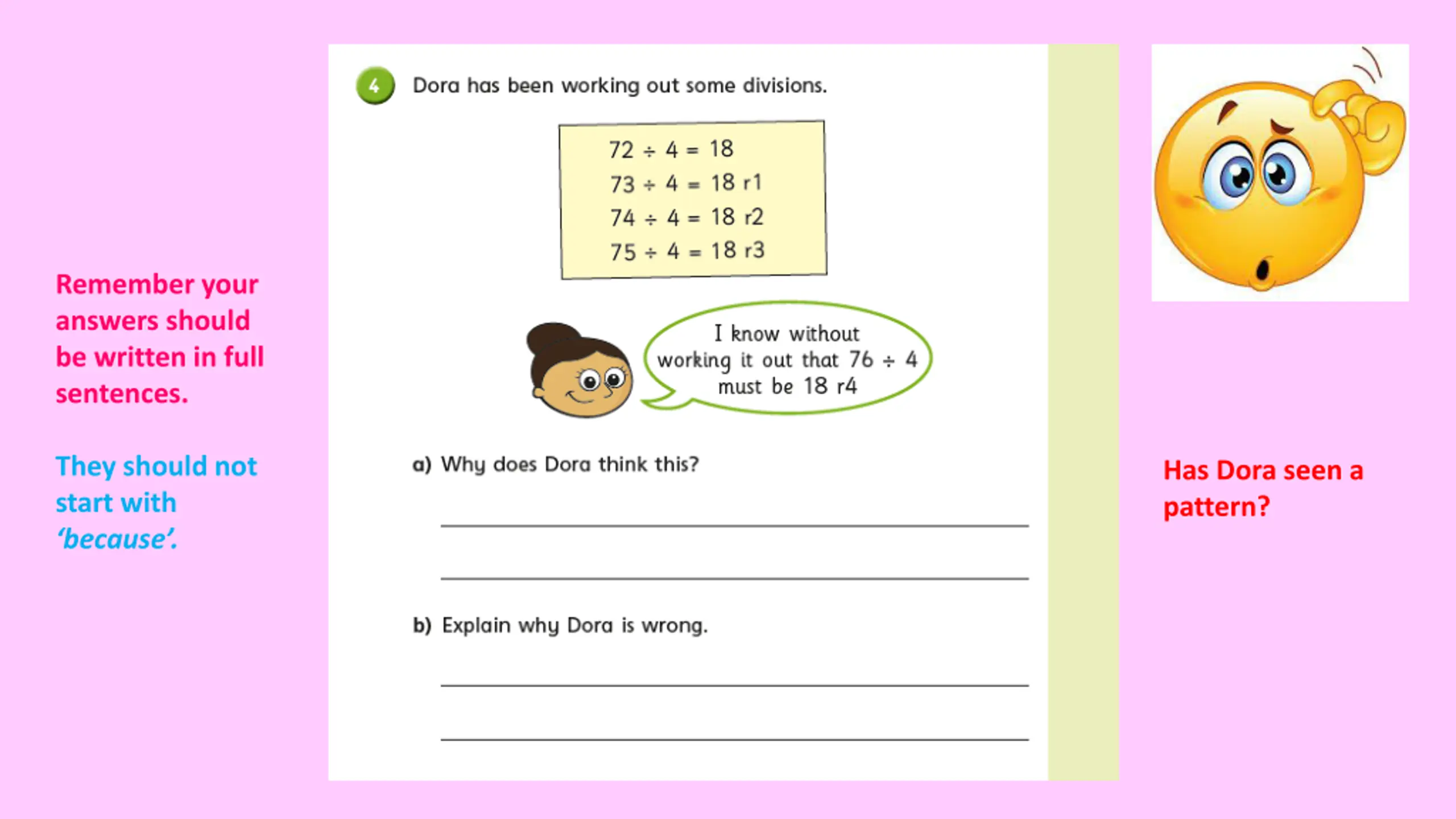 Remember your answers should be written in full sentences. They should not start with because . Has Dora seen a pattern?