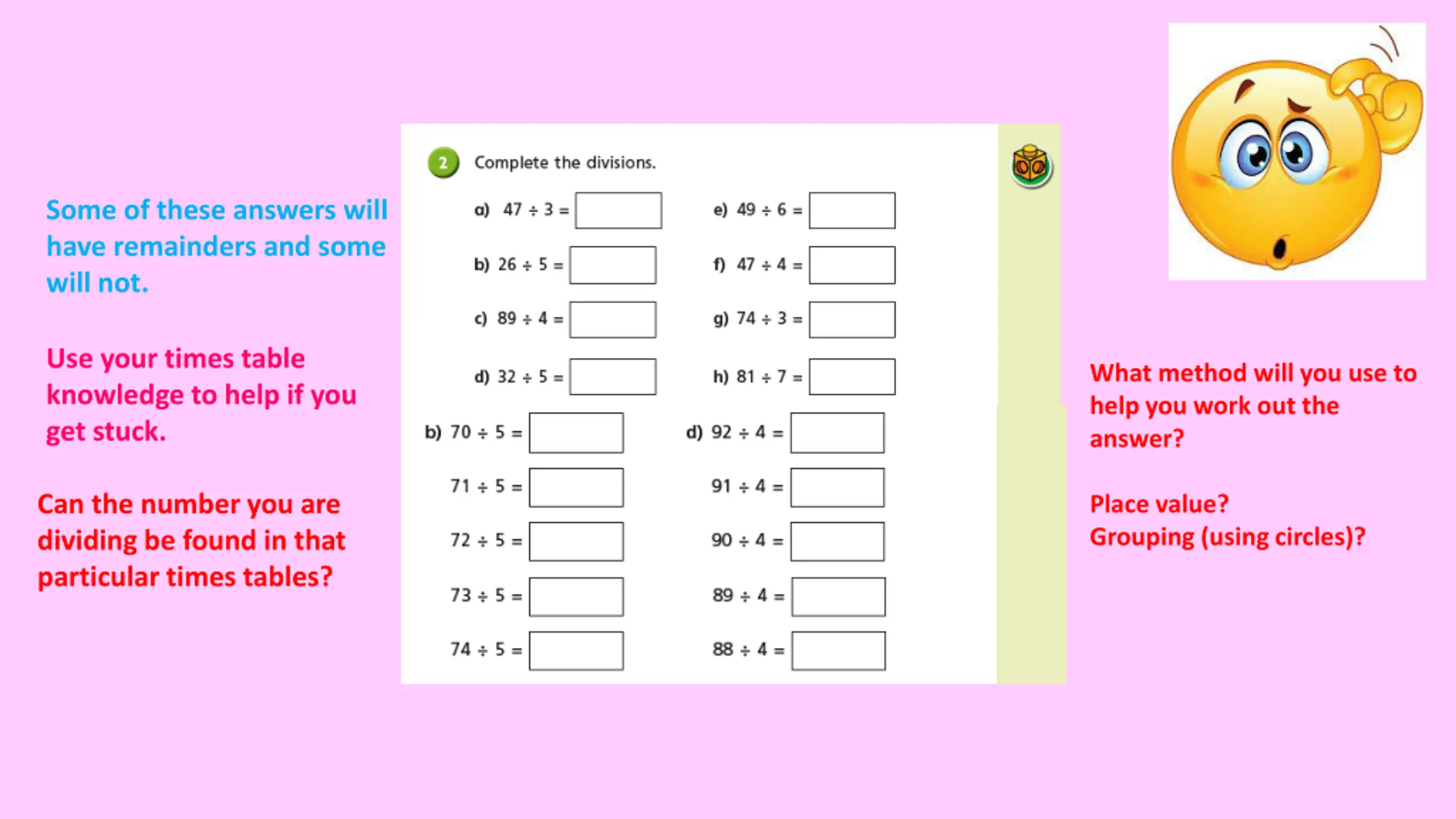 Some of these answers will have remainders and some will not. Use your times table knowledge to help if you get stuck. What method will you use to help you work out the answer? Can the number you are dividing be found in that particular times tables? Place value? Grouping (using circles)?