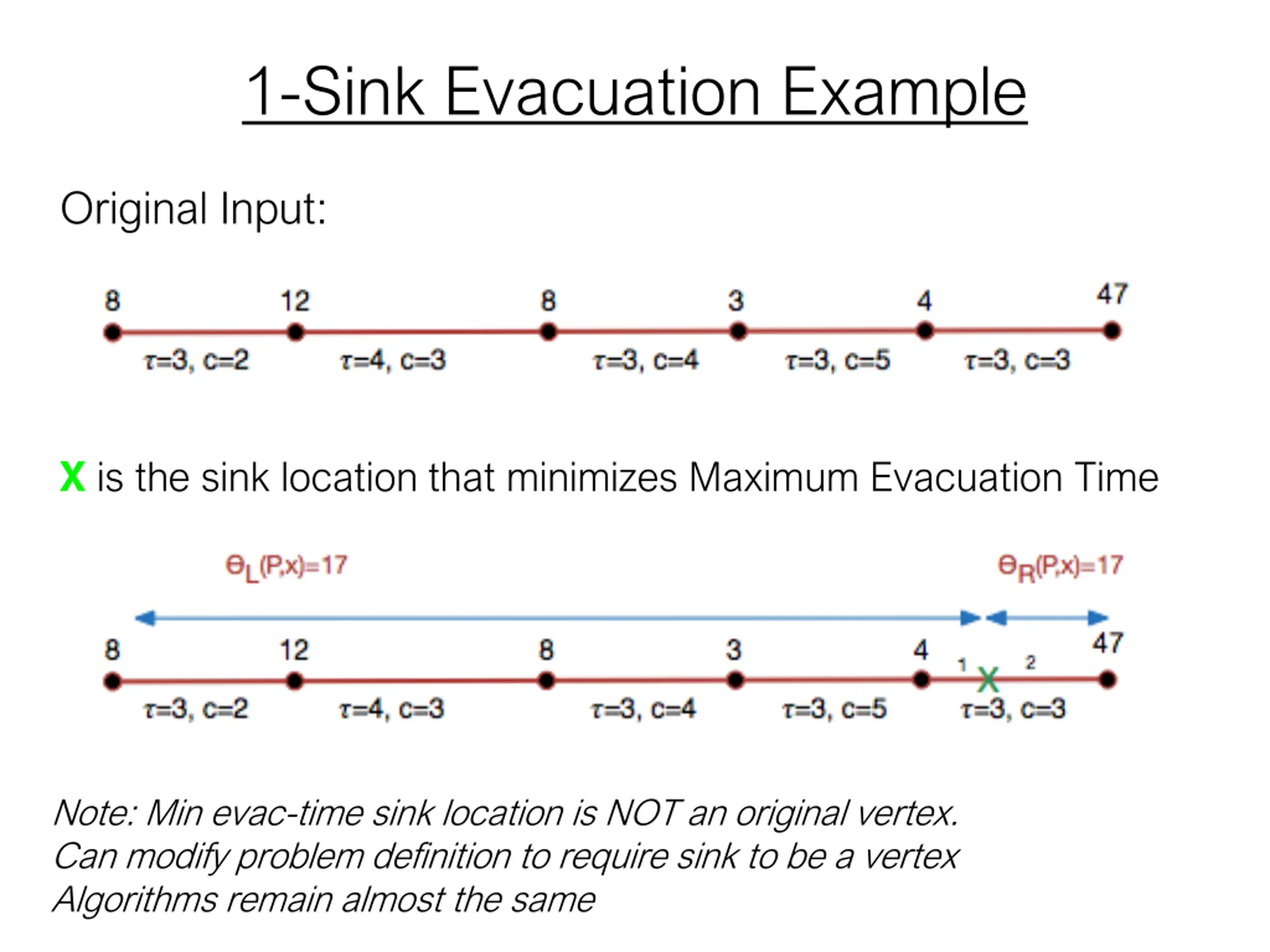 1-Sink Evacuation Example Original Input: X is the sink location that minimizes Maximum Evacuation Time Note: Min evac-time sink location is NOT an original vertex. Can modify problem definition to require sink to be a vertex Algorithms remain almost the same