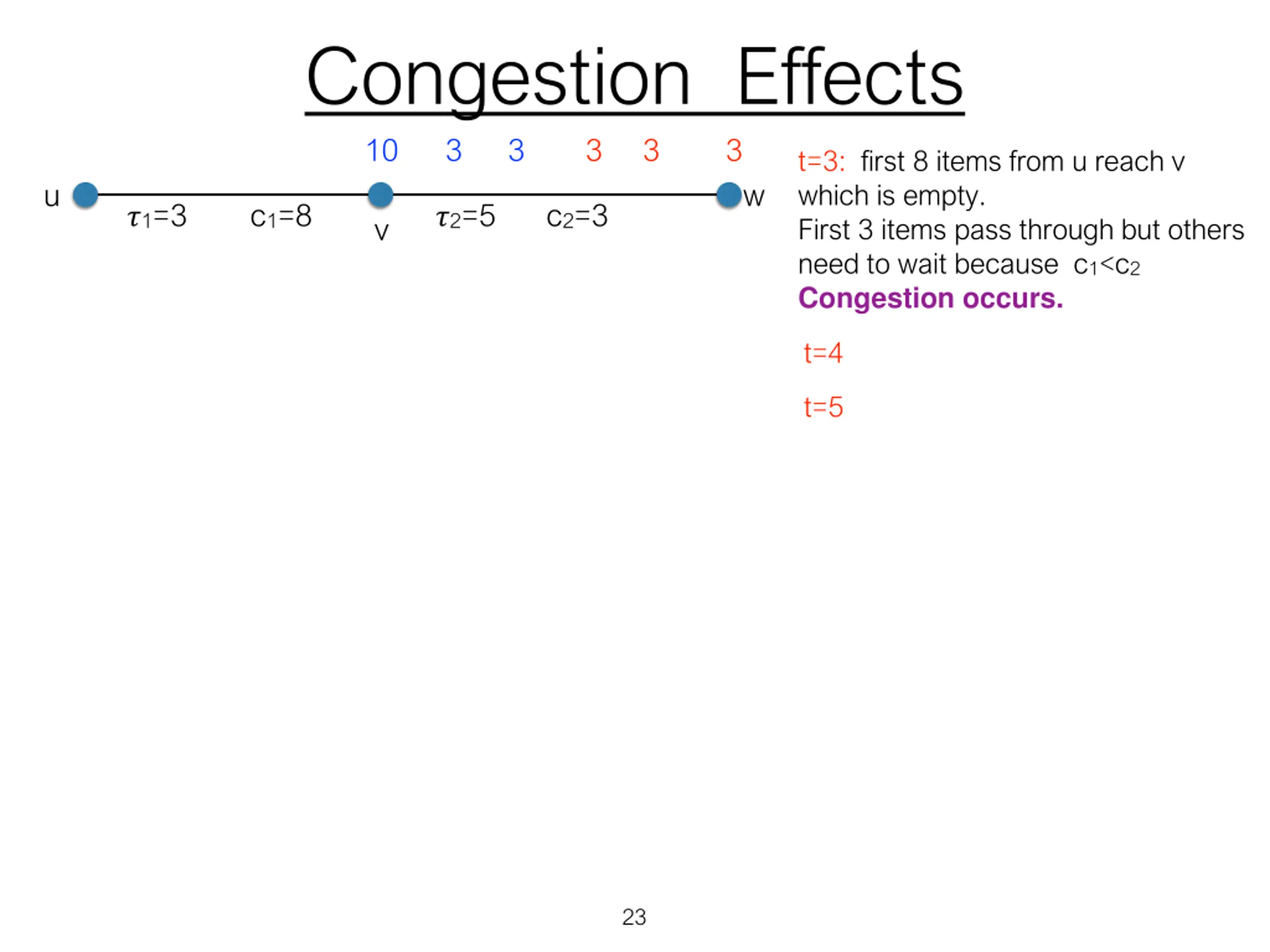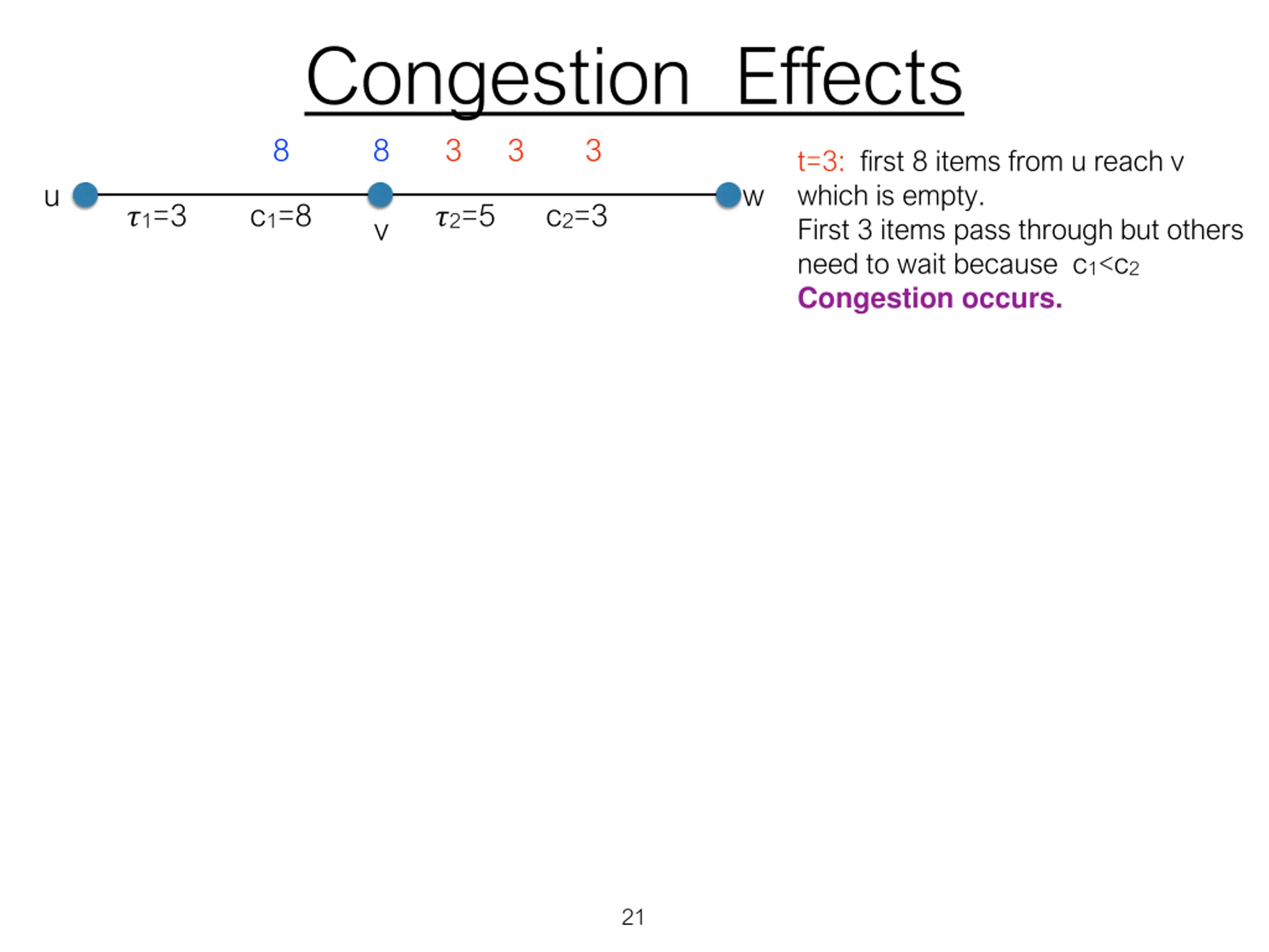 Congestion Effects 10 3 3 3 3 3 t=3: first 8 items from u reach v which is empty. First 3 items pass through but others need to wait because c1<c2 Congestion occurs. u w ?1=3 c1=8 ?2=5 c2=3 v t=4 t=5 23