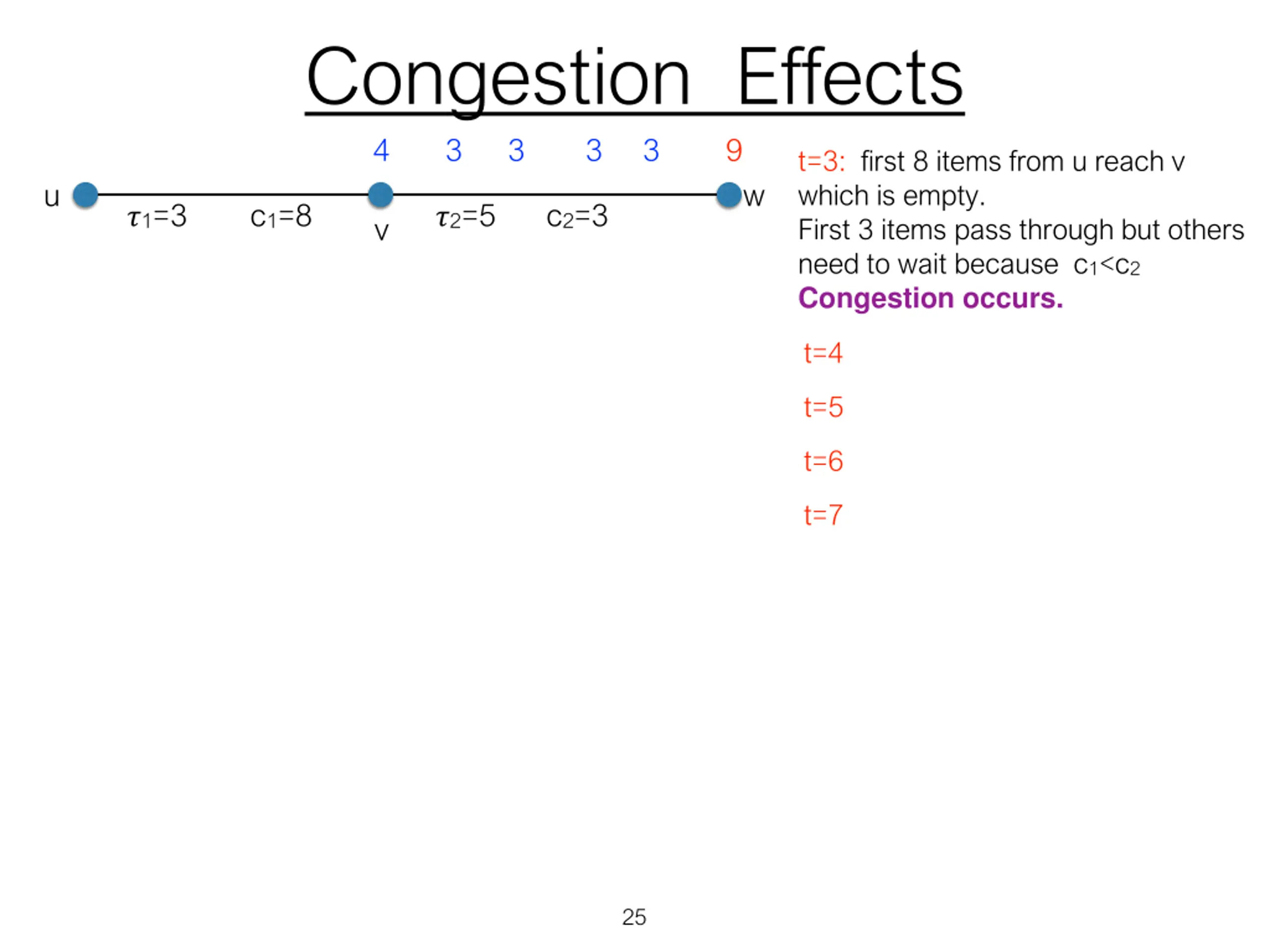 Congestion Effects 7 3 3 3 3 6 t=3: first 8 items from u reach v which is empty. First 3 items pass through but others need to wait because c1<c2 Congestion occurs. u w ?1=3 c1=8 ?2=5 c2=3 v t=4 t=5 t=6 24