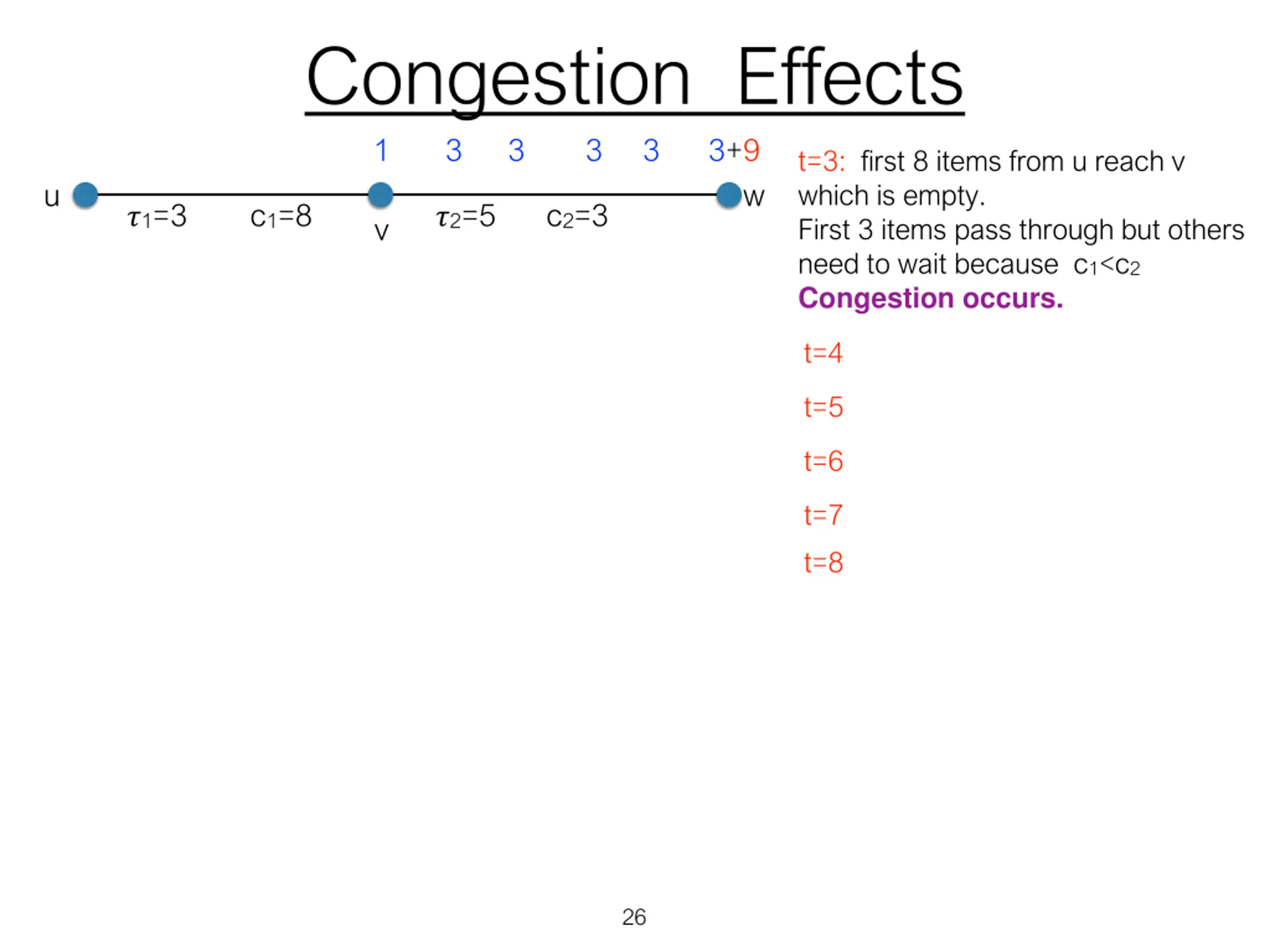 Congestion Effects 4 3 3 3 3 9 t=3: first 8 items from u reach v which is empty. First 3 items pass through but others need to wait because c1<c2 Congestion occurs. u w ?1=3 c1=8 ?2=5 c2=3 v t=4 t=5 t=6 t=7 25