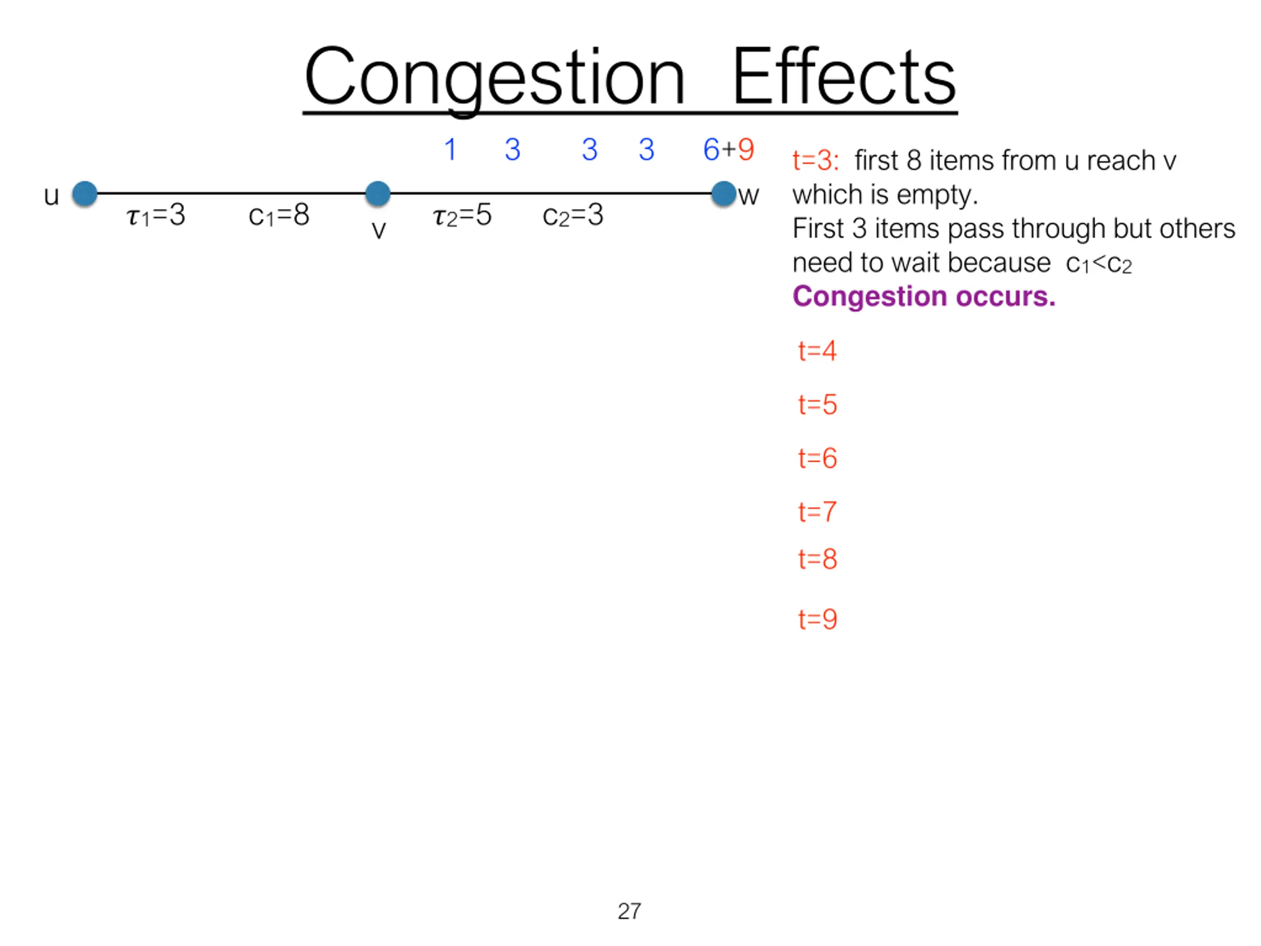 Congestion Effects 1 3 3 3 3 3+9 t=3: first 8 items from u reach v which is empty. First 3 items pass through but others need to wait because c1<c2 Congestion occurs. u w ?1=3 c1=8 ?2=5 c2=3 v t=4 t=5 t=6 t=7 t=8 26