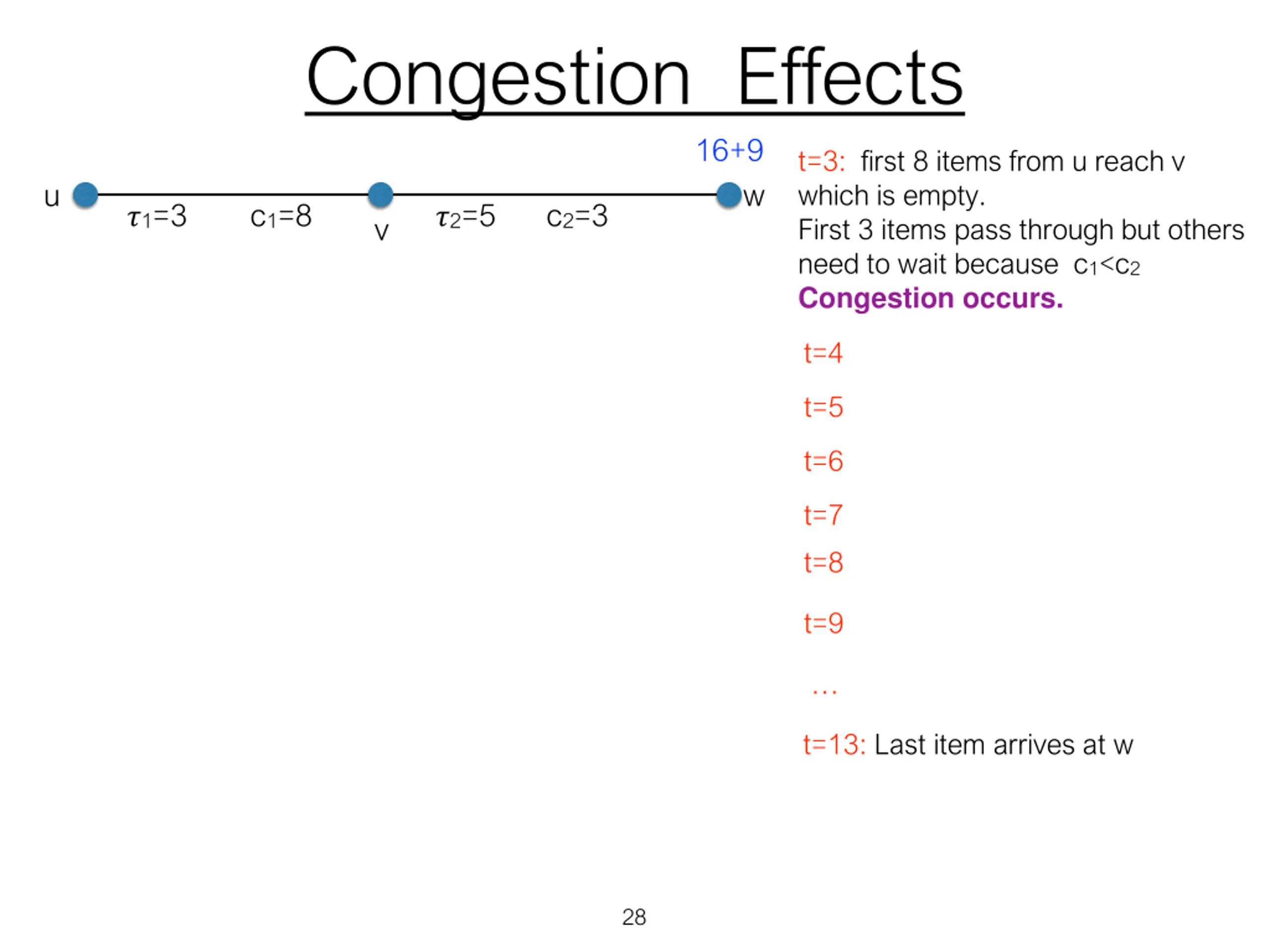 Congestion Effects 1 3 3 3 6+9 t=3: first 8 items from u reach v which is empty. First 3 items pass through but others need to wait because c1<c2 Congestion occurs. u w ?1=3 c1=8 ?2=5 c2=3 v t=4 t=5 t=6 t=7 t=8 t=9 27
