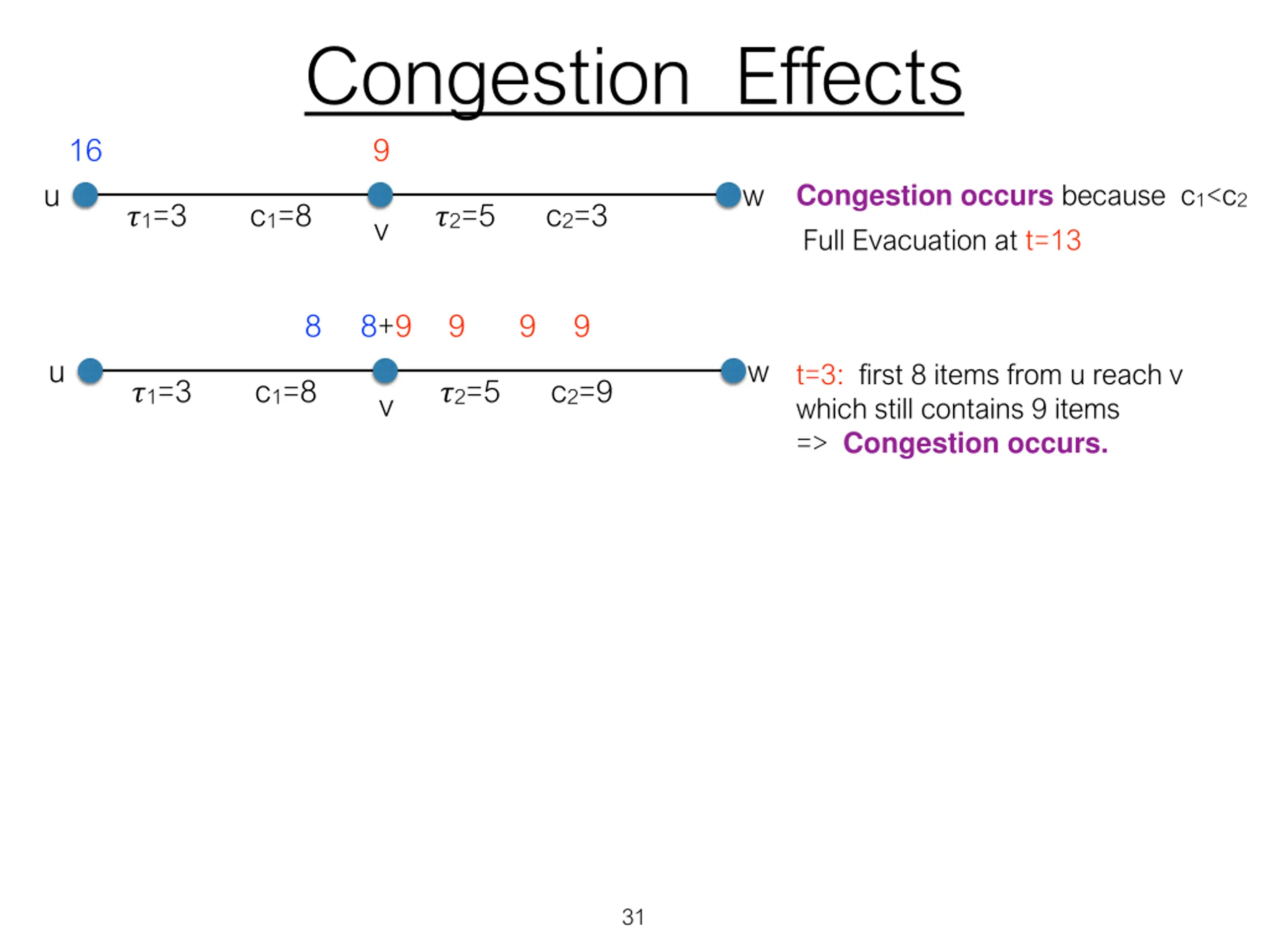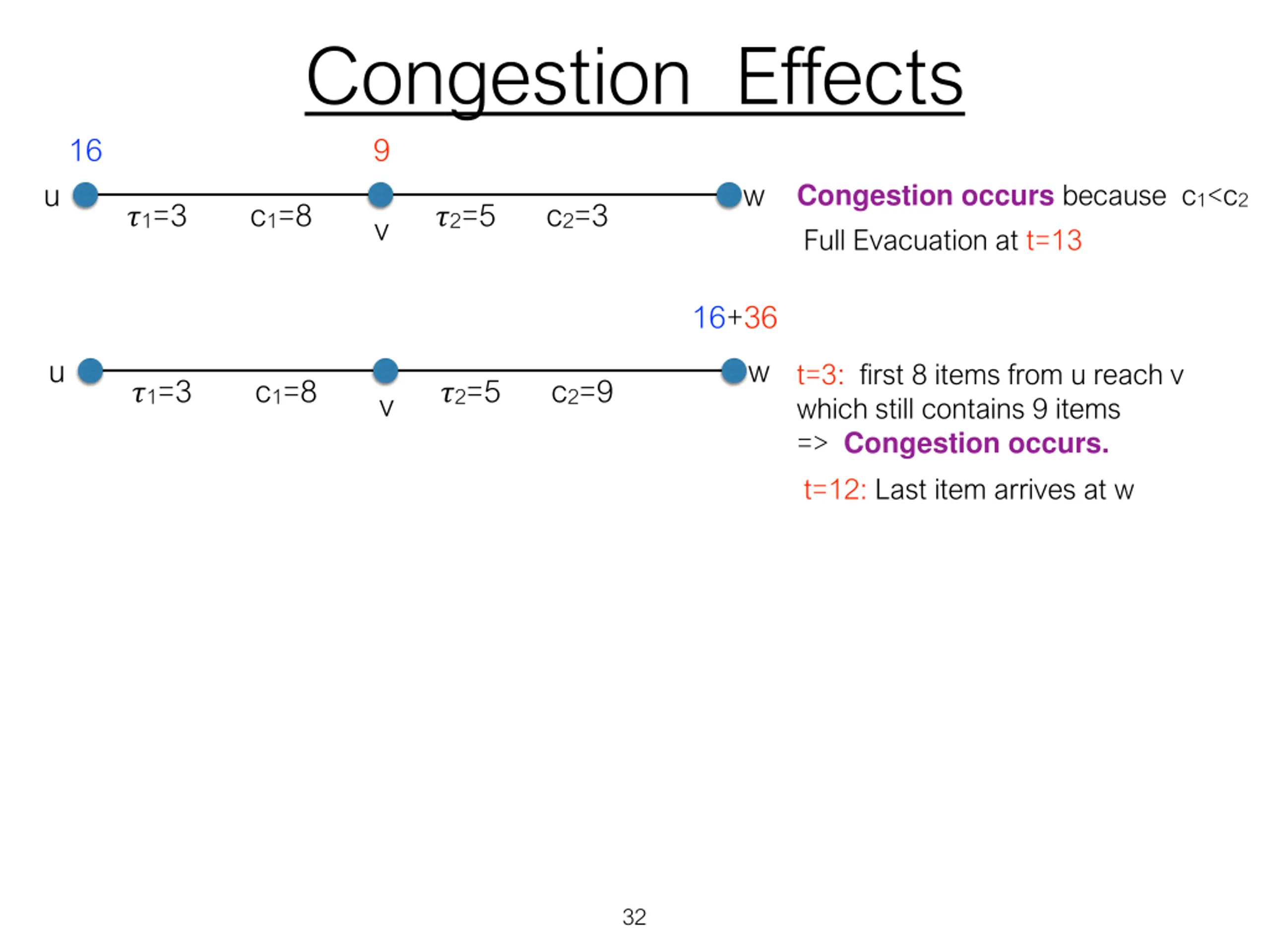 Congestion Effects 9 16 u w Congestion occurs because c1<c2 Full Evacuation at t=13 ?1=3 c1=8 ?2=5 c2=3 v 8 8+9 9 9 9 u w t=3: first 8 items from u reach v which still contains 9 items => Congestion occurs. ?1=3 c1=8 ?2=5 c2=9 v 31