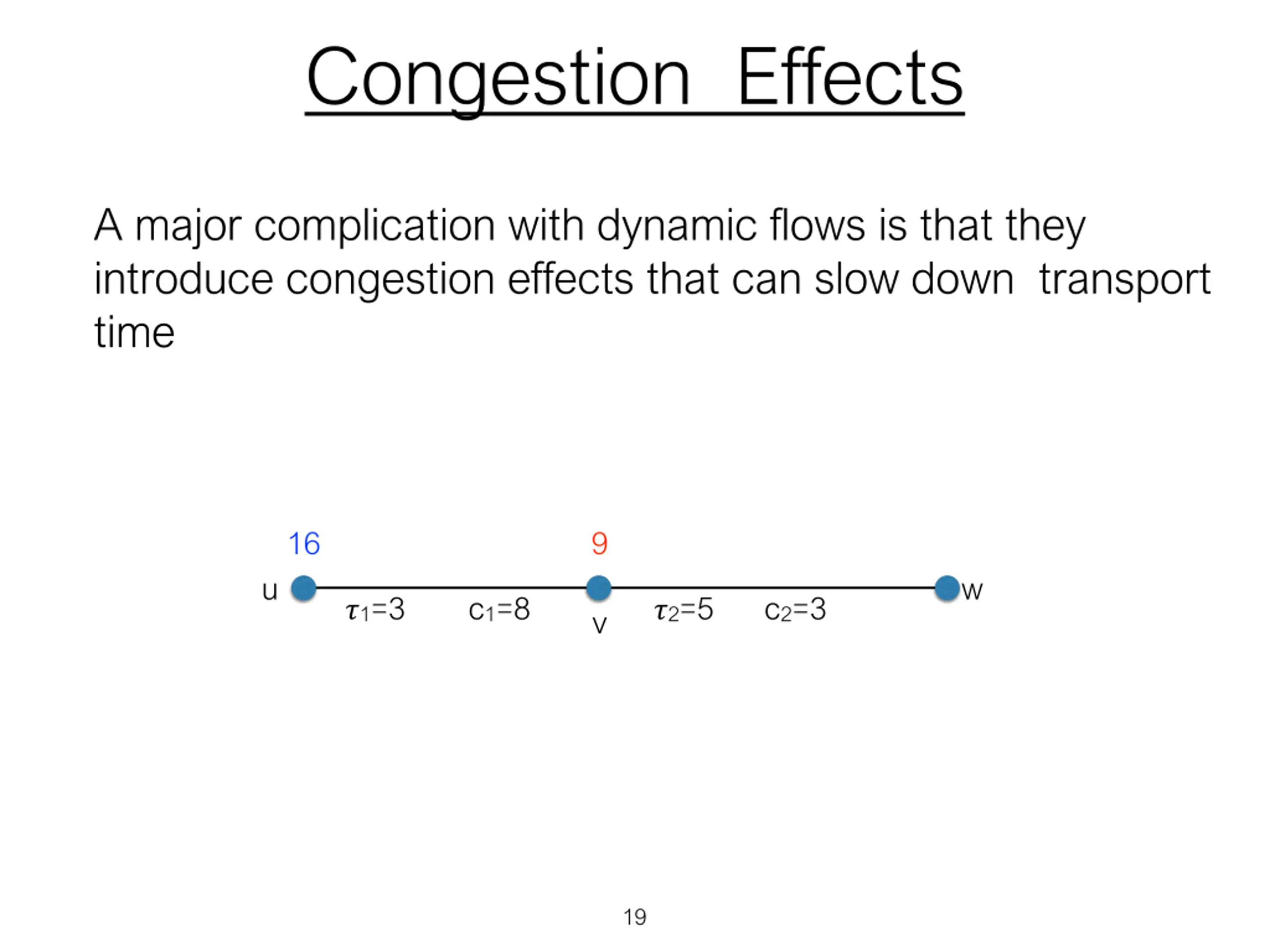 Congestion Effects A major complication with dynamic flows is that they introduce congestion effects that can slow down transport time 16 9 u w ?1=3 c1=8 ?2=5 c2=3 v 19