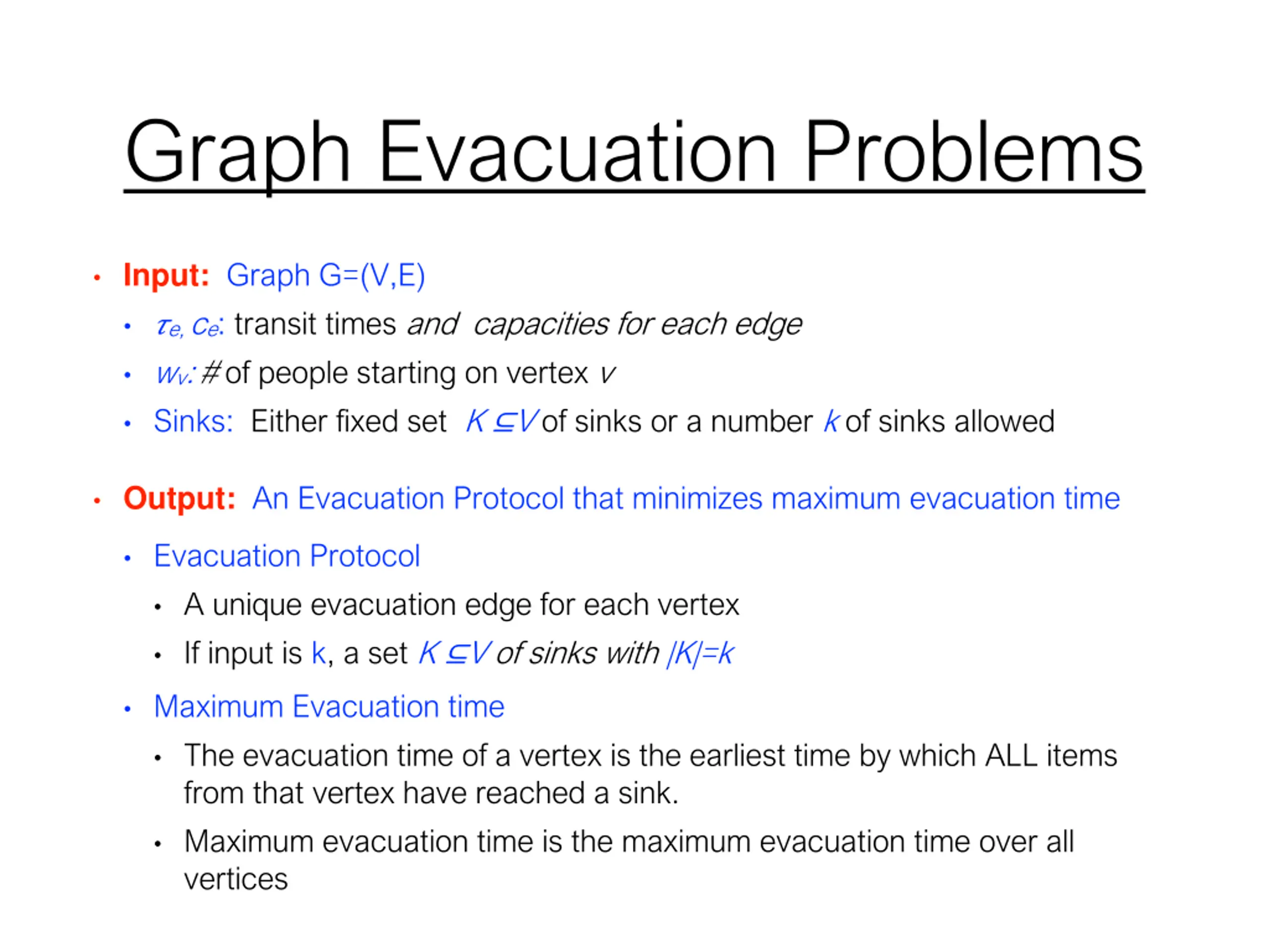 Graph Evacuation Problems Input: Graph G=(V,E) ?e, ce: transit times and capacities for each edge wv:# of people starting on vertex v Sinks: Either fixed set K V of sinks or a number k of sinks allowed Output: An Evacuation Protocol that minimizes maximum evacuation time Evacuation Protocol A unique evacuation edge for each vertex If input is k, a set K V of sinks with |K|=k Maximum Evacuation time The evacuation time of a vertex is the earliest time by which ALL items from that vertex have reached a sink. Maximum evacuation time is the maximum evacuation time over all vertices