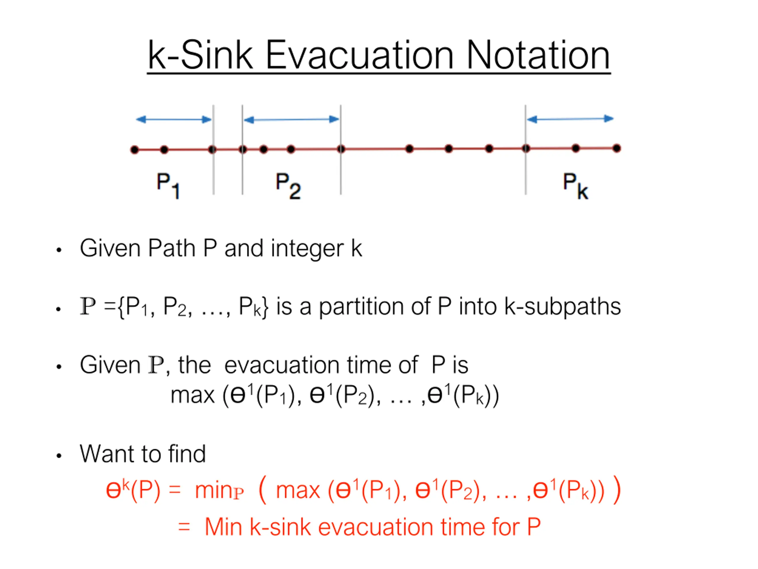 k-Sink Evacuation Notation Given Path P and integer k P ={P1, P2, , Pk} is a partition of P into k-subpaths Given P, the evacuation time of P is max ( 1(P1), 1(P2), , 1(Pk)) Want to find k(P) = minP( max ( 1(P1), 1(P2), , 1(Pk)) ) = Min k-sink evacuation time for P