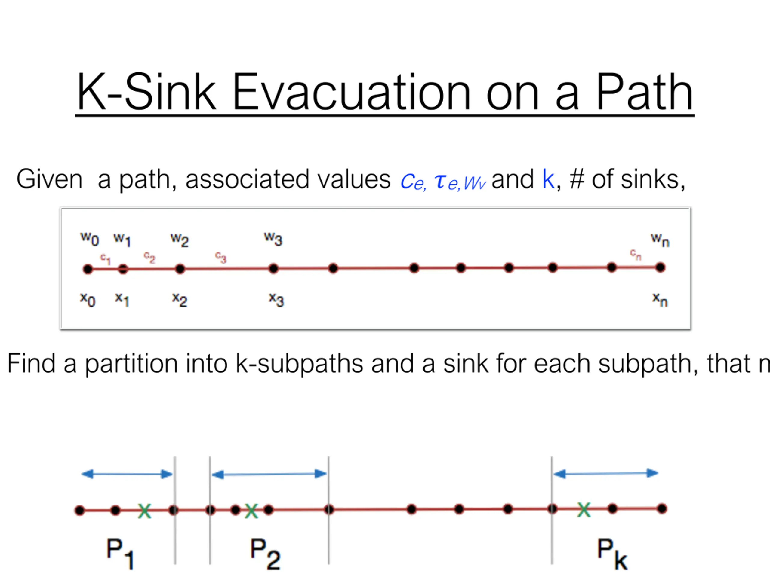 K-Sink Evacuation on a Path Given a path, associated values ce,?e,Wv and k, # of sinks, Find a partition into k-subpaths and a sink for each subpath, that minimizes the maximum evacuation time over all subpaths.