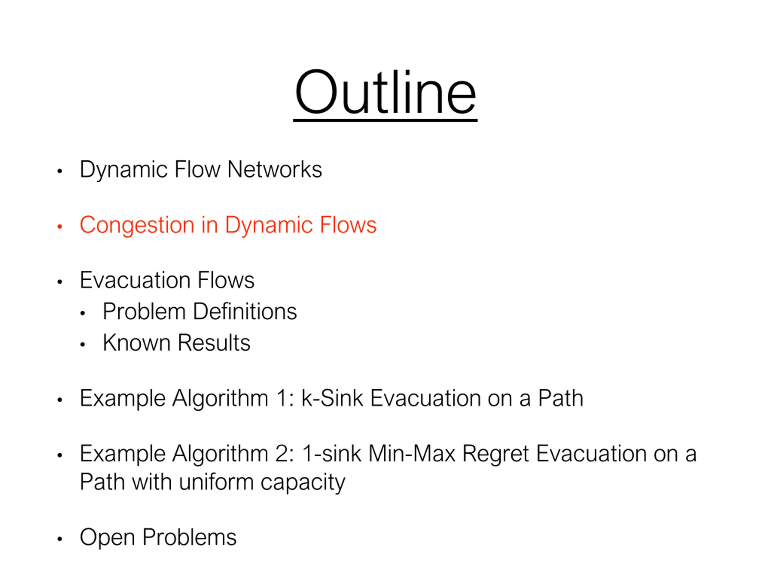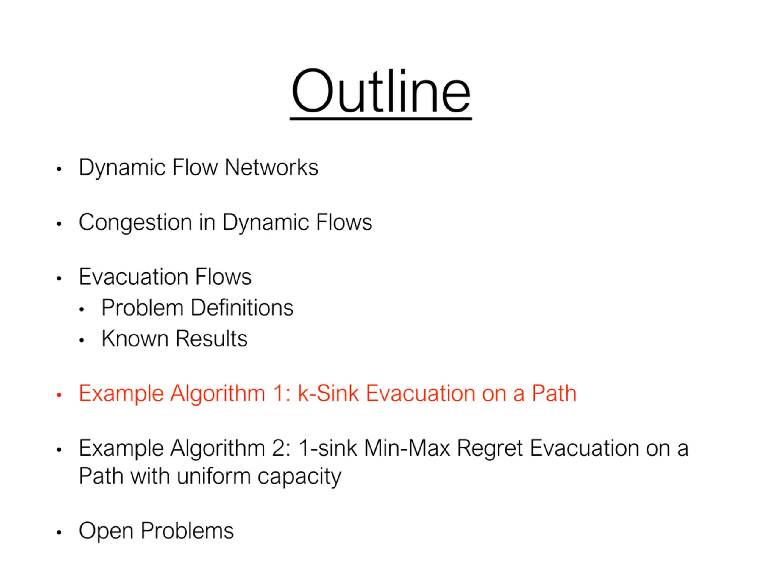 Outline Dynamic Flow Networks Congestion in Dynamic Flows Evacuation Flows Problem Definitions Known Results Example Algorithm 1: k-Sink Evacuation on a Path Example Algorithm 2: 1-sink Min-Max Regret Evacuation on a Path with uniform capacity Open Problems