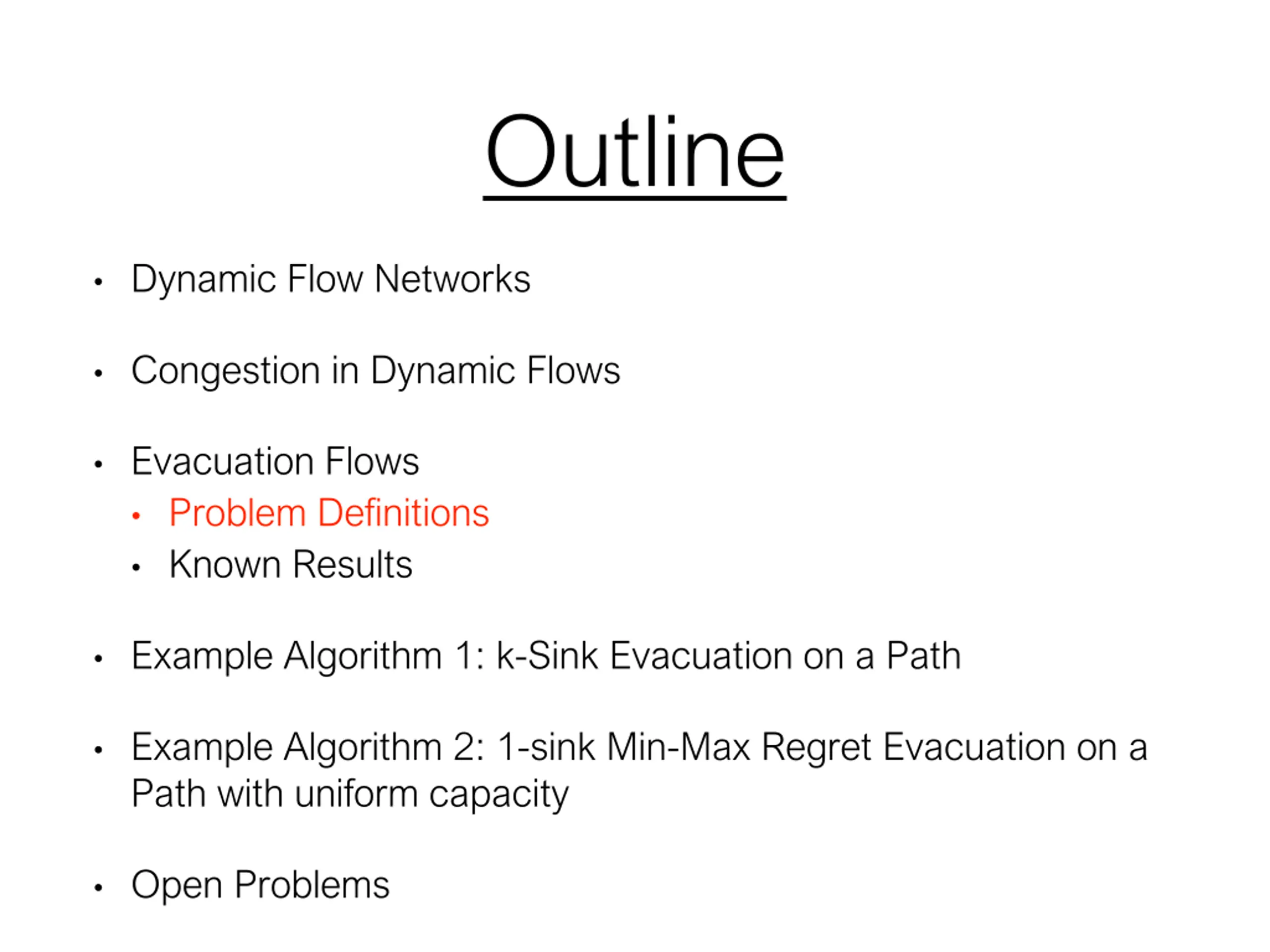 Outline Dynamic Flow Networks Congestion in Dynamic Flows Evacuation Flows Problem Definitions Known Results Example Algorithm 1: k-Sink Evacuation on a Path Example Algorithm 2: 1-sink Min-Max Regret Evacuation on a Path with uniform capacity Open Problems 3