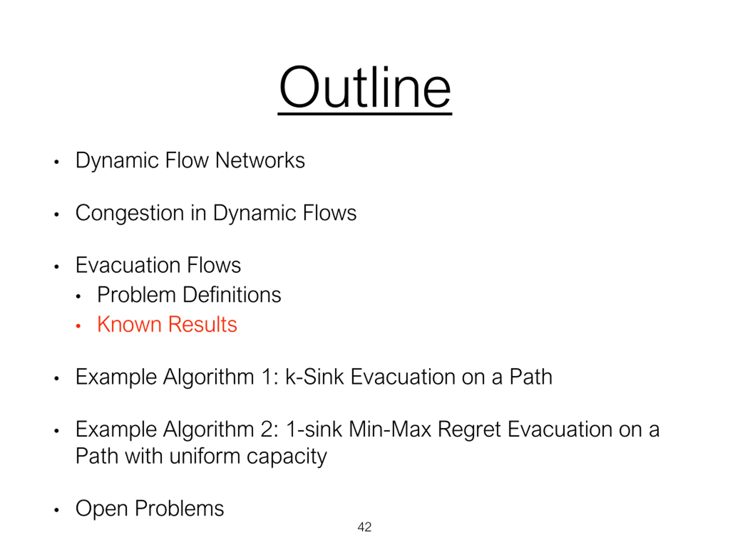 Outline Dynamic Flow Networks Congestion in Dynamic Flows Evacuation Flows Problem Definitions Known Results Example Algorithm 1: k-Sink Evacuation on a Path Example Algorithm 2: 1-sink Min-Max Regret Evacuation on a Path with uniform capacity Open Problems 42