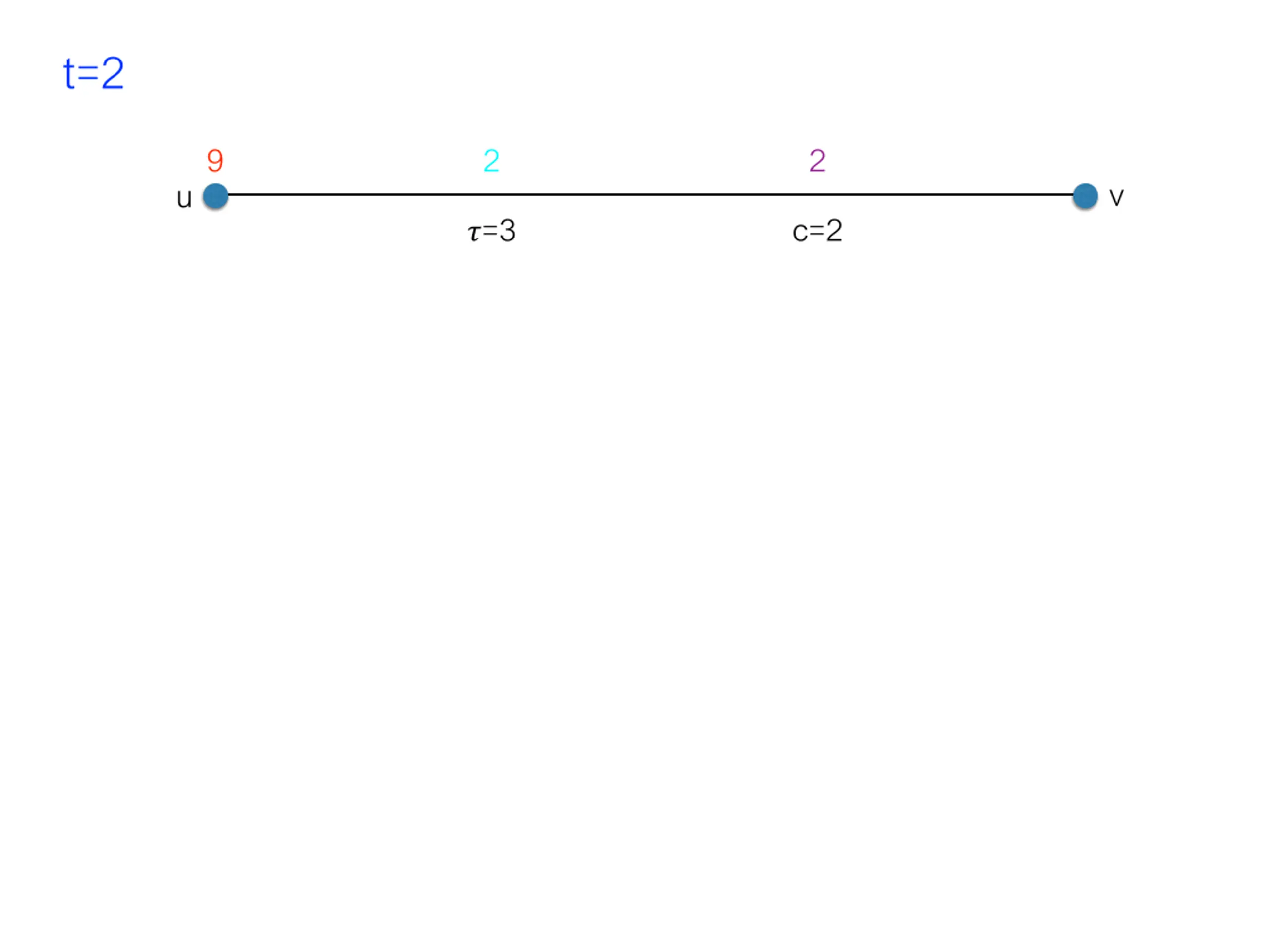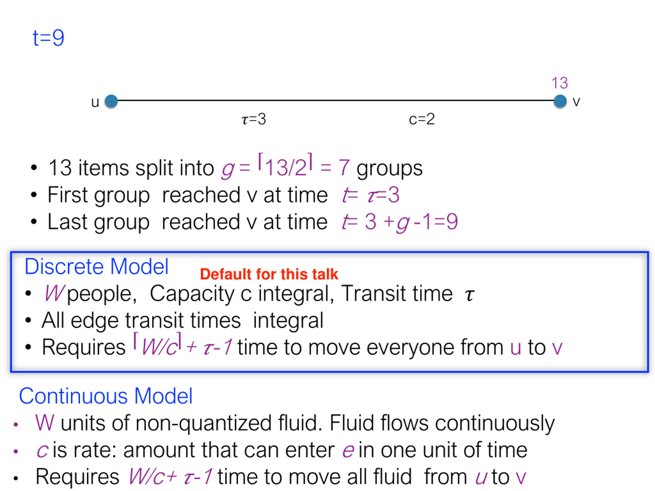 t=9 13 v u c=2 ?=3 13 items split into g = 13/2 = 7 groups First group reached v at time t= ?=3 Last group reached v at time t= 3 +g -1=9 Discrete Model W people, Capacity c integral, Transit time ? All edge transit times integral Requires W/c + ?-1 time to move everyone from u to v Default for this talk Continuous Model W units of non-quantized fluid. Fluid flows continuously c is rate: amount that can enter e in one unit of time Requires W/c+ ?-1 time to move all fluid from u to v