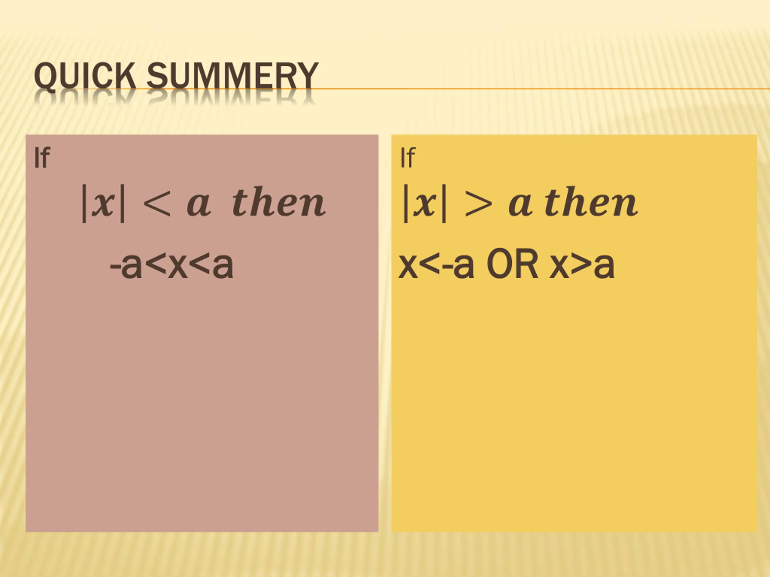 QUICK SUMMERY If If If ? < ? ???? - -a<x<a a<x<a ? > ? ???? x< x<- -a OR a OR x>a x>a