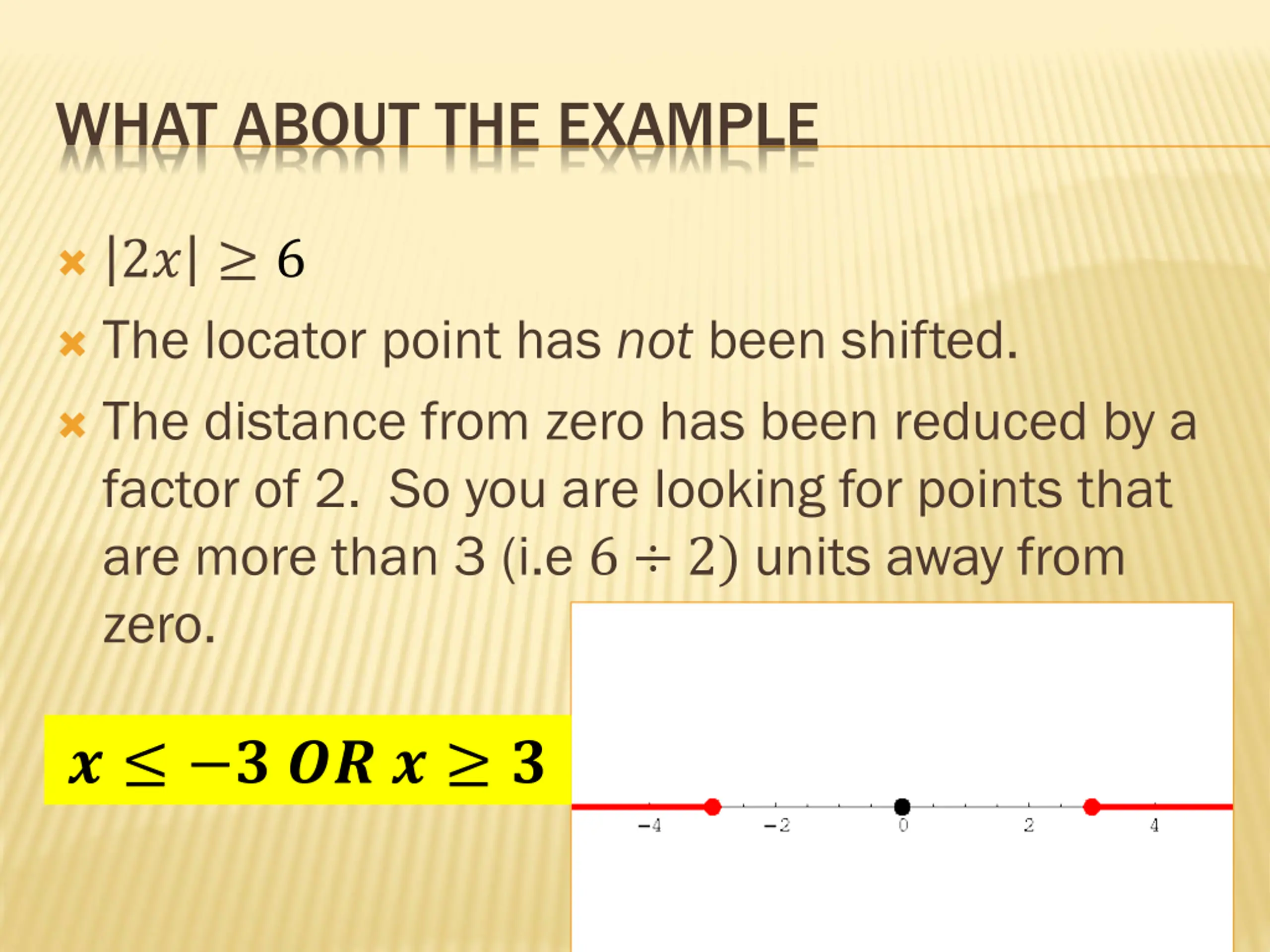 WHAT ABOUT THE EXAMPLE 2? 6 The locator point has not been shifted. The distance from zero has been reduced by a factor of 2. So you are looking for points that are more than 3 (i.e 6 2) units away from zero. ? ? ?? ? ?