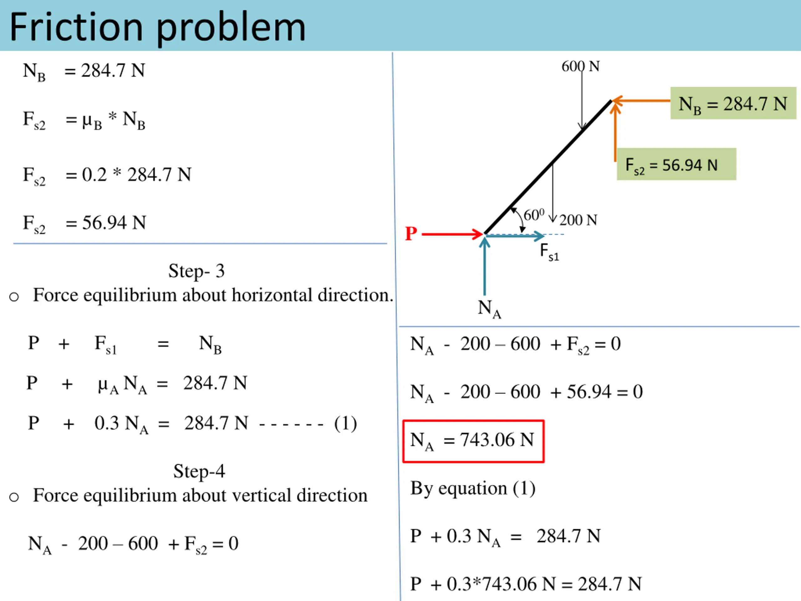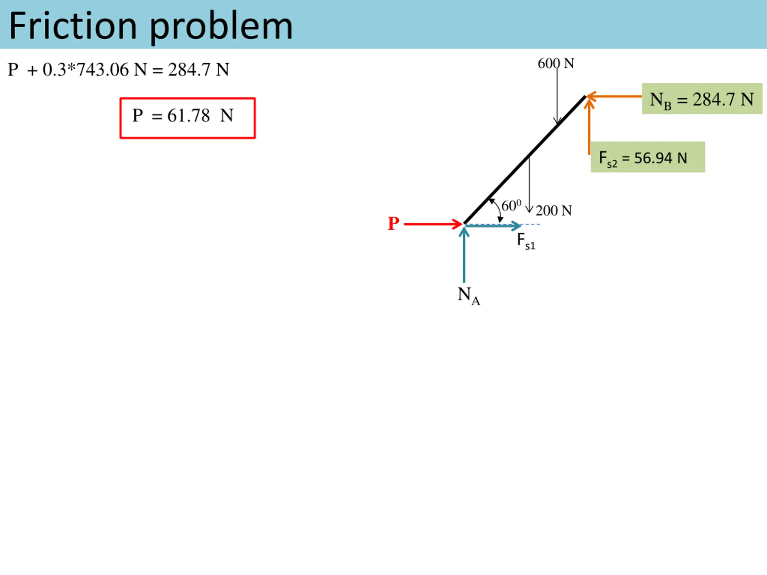 Friction problem P + 0.3*743.06 N = 284.7 N 600 N P = 61.78 N NB = 284.7 N Fs2 = 56.94 N 600 200 N P Fs1 NA