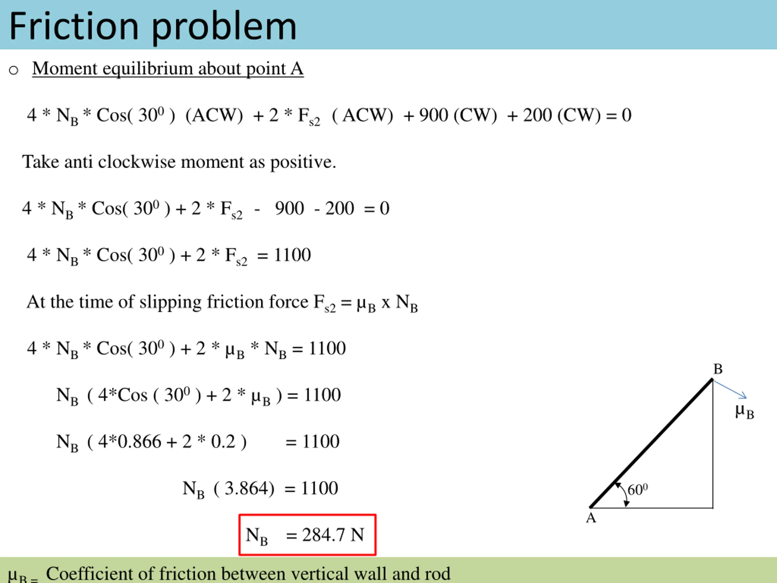 Friction problem o Moment equilibrium about point A 4 * NB * Cos( 300 ) (ACW) + 2 * Fs2 ( ACW) + 900 (CW) + 200 (CW) = 0 Take anti clockwise moment as positive. 4 * NB * Cos( 300 ) + 2 * Fs2 - 900 - 200 = 0 4 * NB * Cos( 300 ) + 2 * Fs2 = 1100 At the time of slipping friction force Fs2 = B x NB 4 * NB * Cos( 300 ) + 2 * B * NB = 1100 B NB ( 4*Cos ( 300 ) + 2 * B ) = 1100 NB ( 4*0.866 + 2 * 0.2 ) = 1100 B NB ( 3.864) = 1100 600 A NB = 284.7 N B = Coefficient of friction between vertical wall and rod
