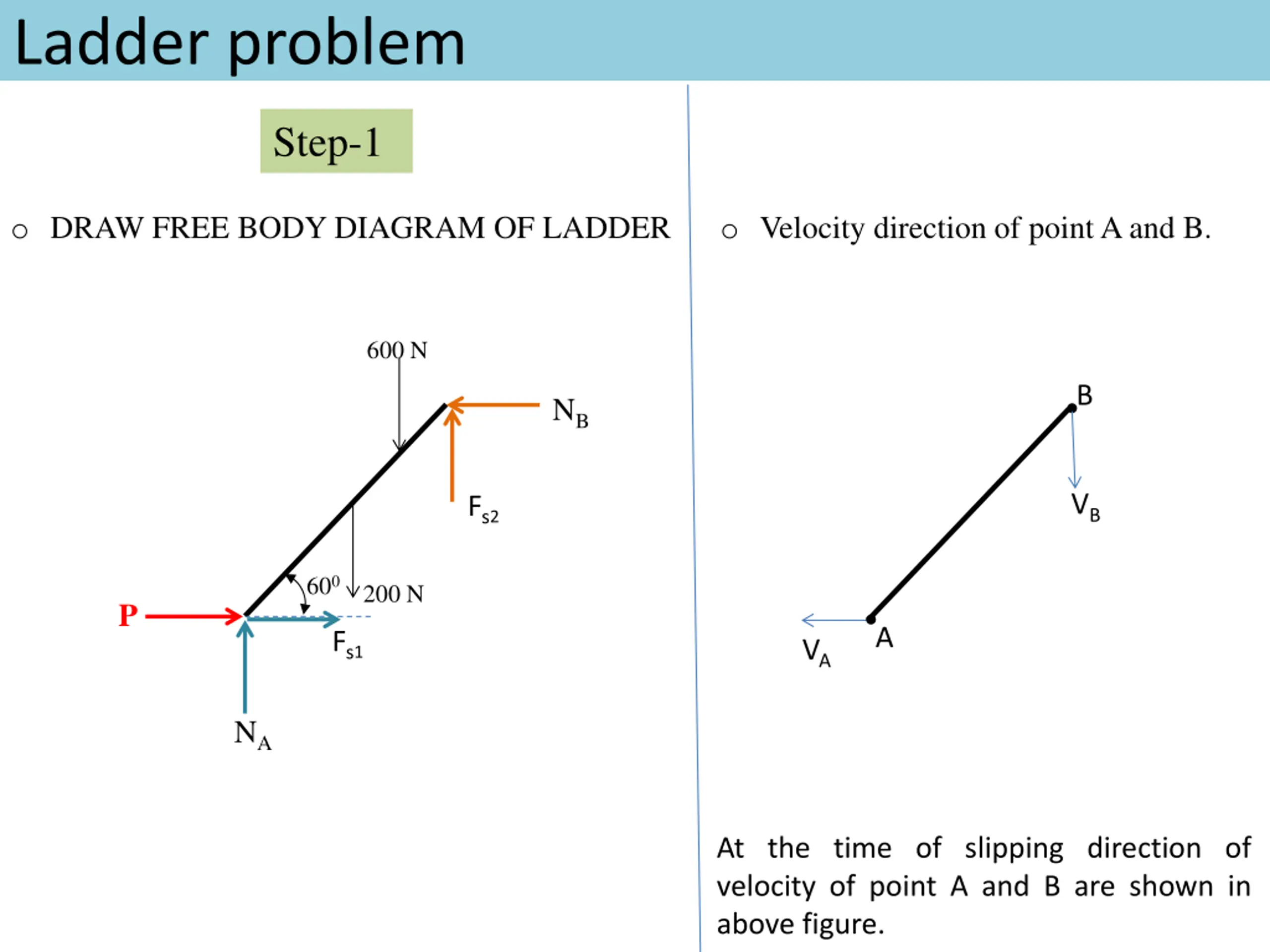 Ladder problem Step-1 o DRAW FREE BODY DIAGRAM OF LADDER o Velocity direction of point A and B. 600 N B NB VB Fs2 600 200 N P A Fs1 VA NA At the time of slipping direction of velocity of point A and B are shown in above figure.