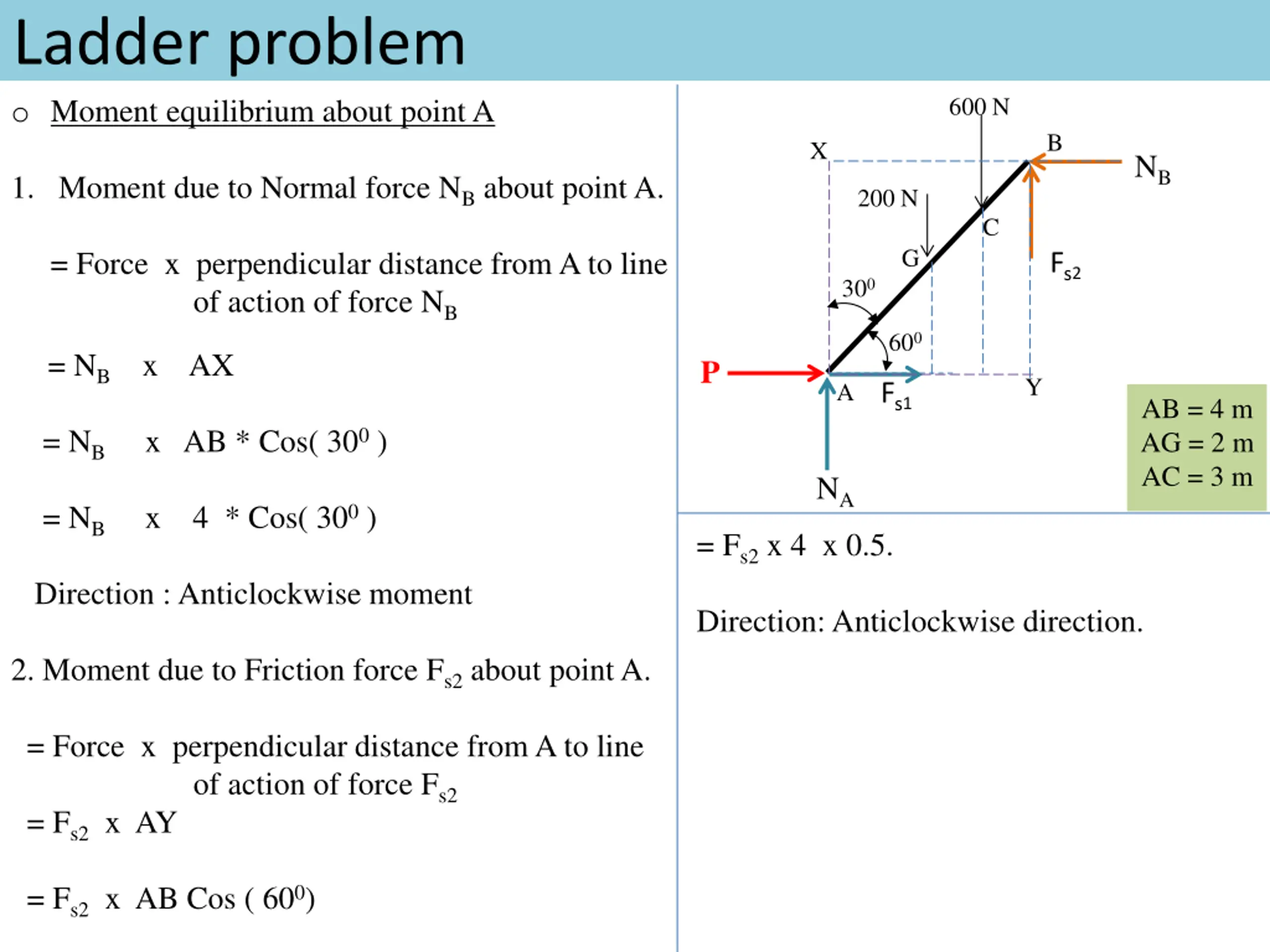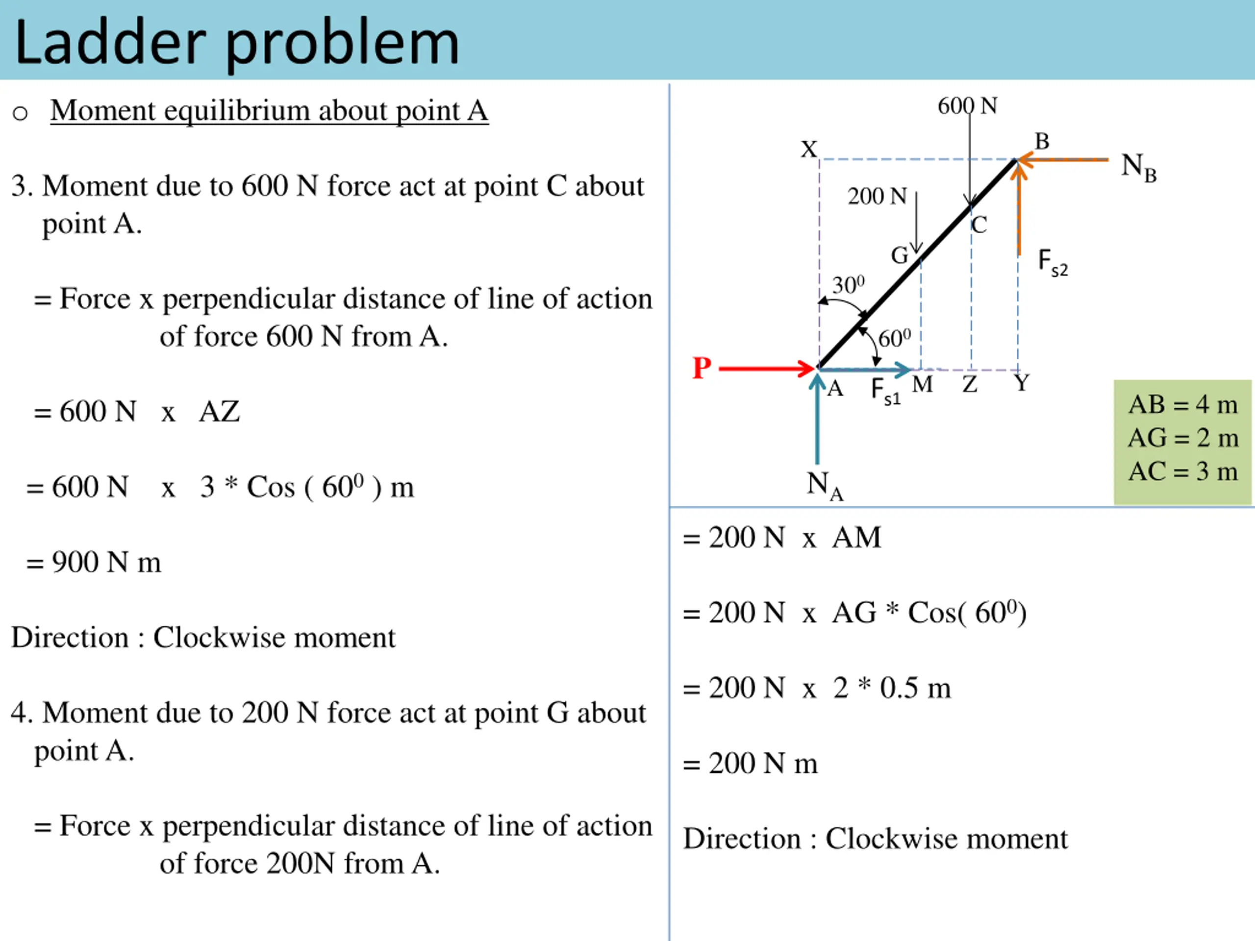 Ladder problem o Moment equilibrium about point A 3. Moment due to 600 N force act at point C about point A. 600 N B X NB 200 N C G Fs2 300 = Force x perpendicular distance of line of action of force 600 N from A. 600 P Y Z M A Fs1 AB = 4 m AG = 2 m AC = 3 m = 600 N x AZ NA = 600 N x 3 * Cos ( 600 ) m = 200 N x AM = 900 N m = 200 N x AG * Cos( 600) Direction : Clockwise moment = 200 N x 2 * 0.5 m 4. Moment due to 200 N force act at point G about point A. = 200 N m = Force x perpendicular distance of line of action of force 200N from A. Direction : Clockwise moment