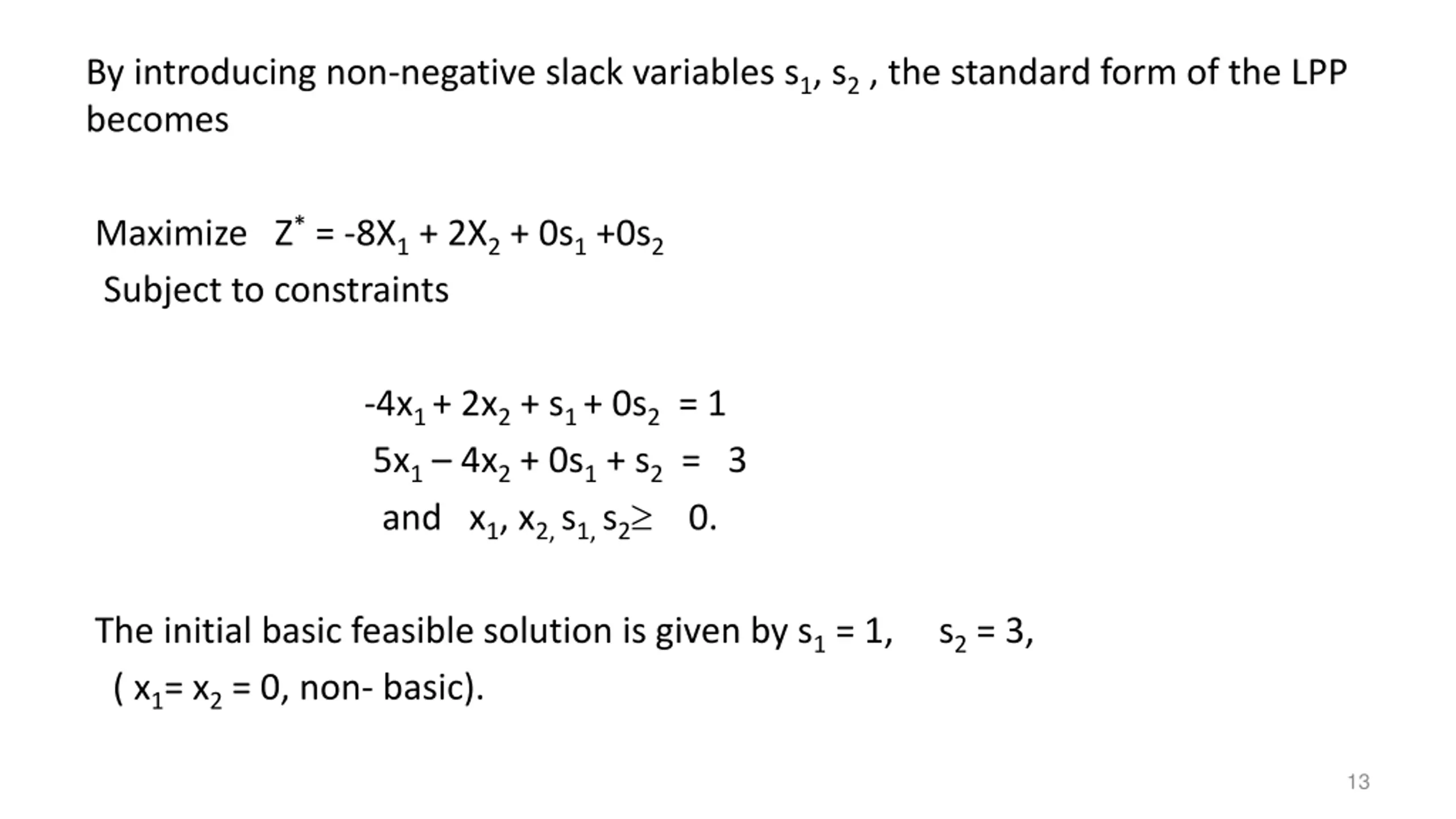 By introducing non-negative slack variables s1, s2, the standard form of the LPP becomes Maximize Z*= -8X1+ 2X2+ 0s1+0s2 Subject to constraints -4x1 + 2x2+ s1 + 0s2= 1 5x1 4x2+ 0s1+ s2= 3 and x1, x2, s1, s2 0. The initial basic feasible solution is given by s1= 1, s2= 3, ( x1= x2= 0, non- basic). 13