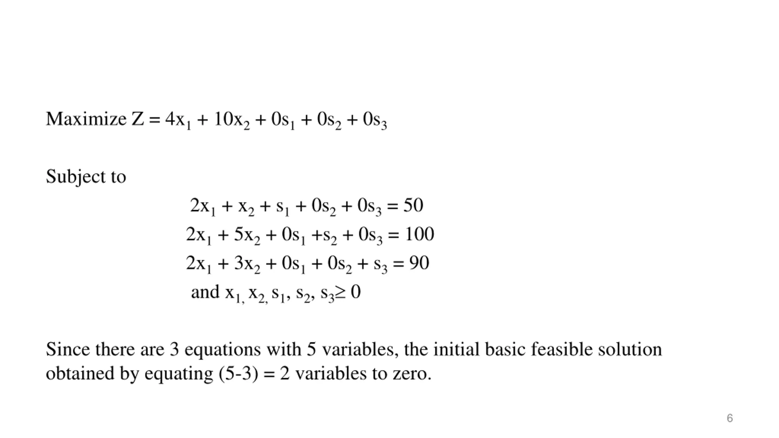 Maximize Z = 4x1+ 10x2+ 0s1+ 0s2+ 0s3 Subject to 2x1+ x2+ s1+ 0s2+ 0s3= 50 2x1+ 5x2+ 0s1+s2+ 0s3= 100 2x1+ 3x2+ 0s1+ 0s2+ s3= 90 and x1, x2, s1, s2, s3 0 Since there are 3 equations with 5 variables, the initial basic feasible solution obtained by equating (5-3) = 2 variables to zero. 6