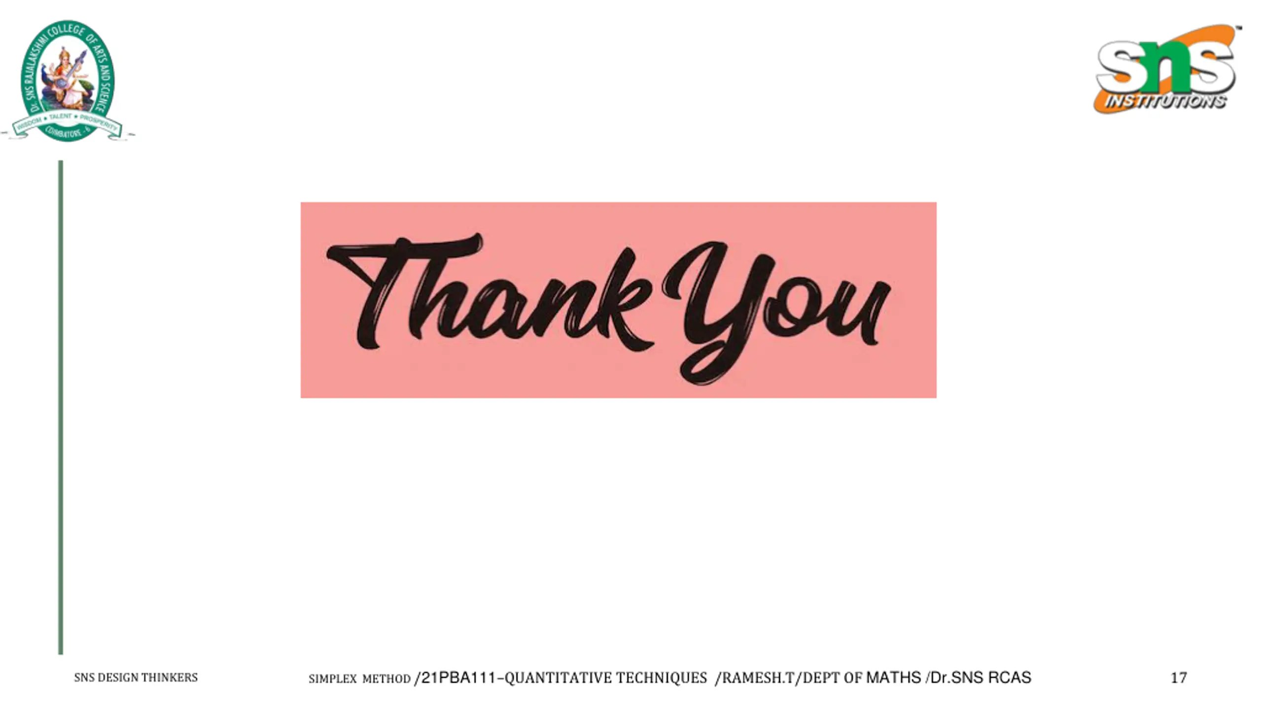 SIMPLEX METHOD /21PBA111QUANTITATIVE TECHNIQUES /RAMESH.T/DEPT OF MATHS /Dr.SNS RCAS 17 SNS DESIGN THINKERS