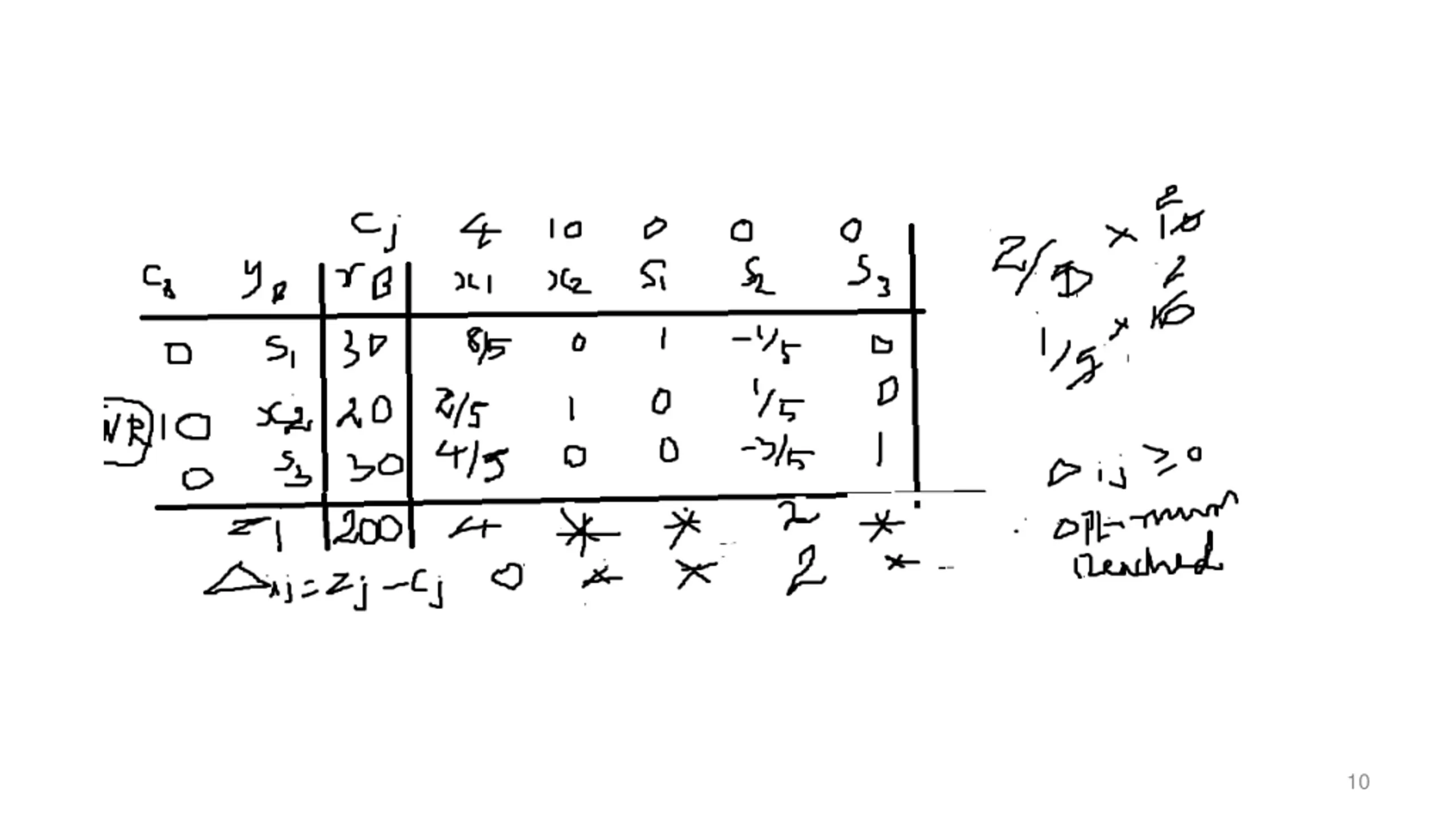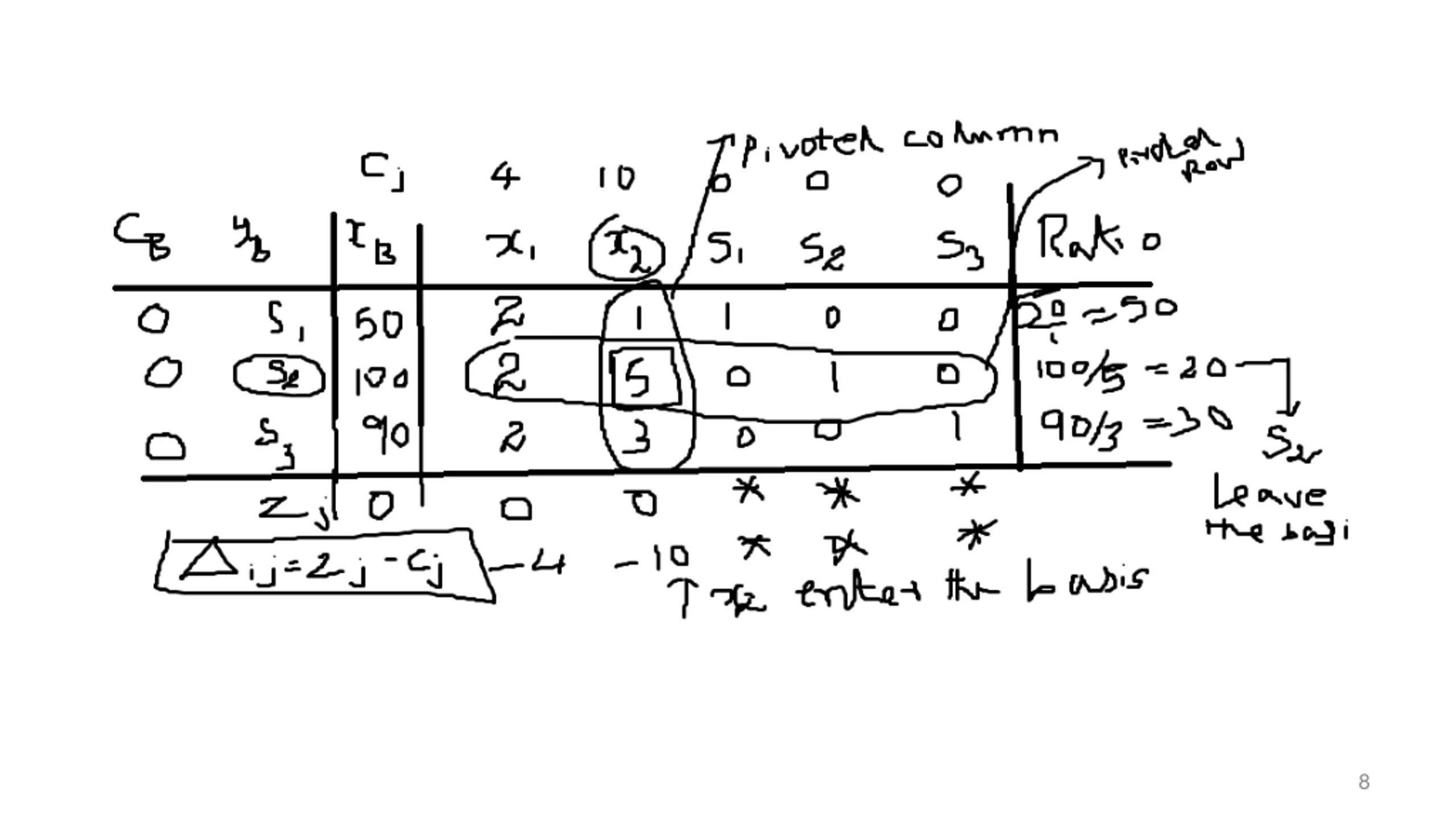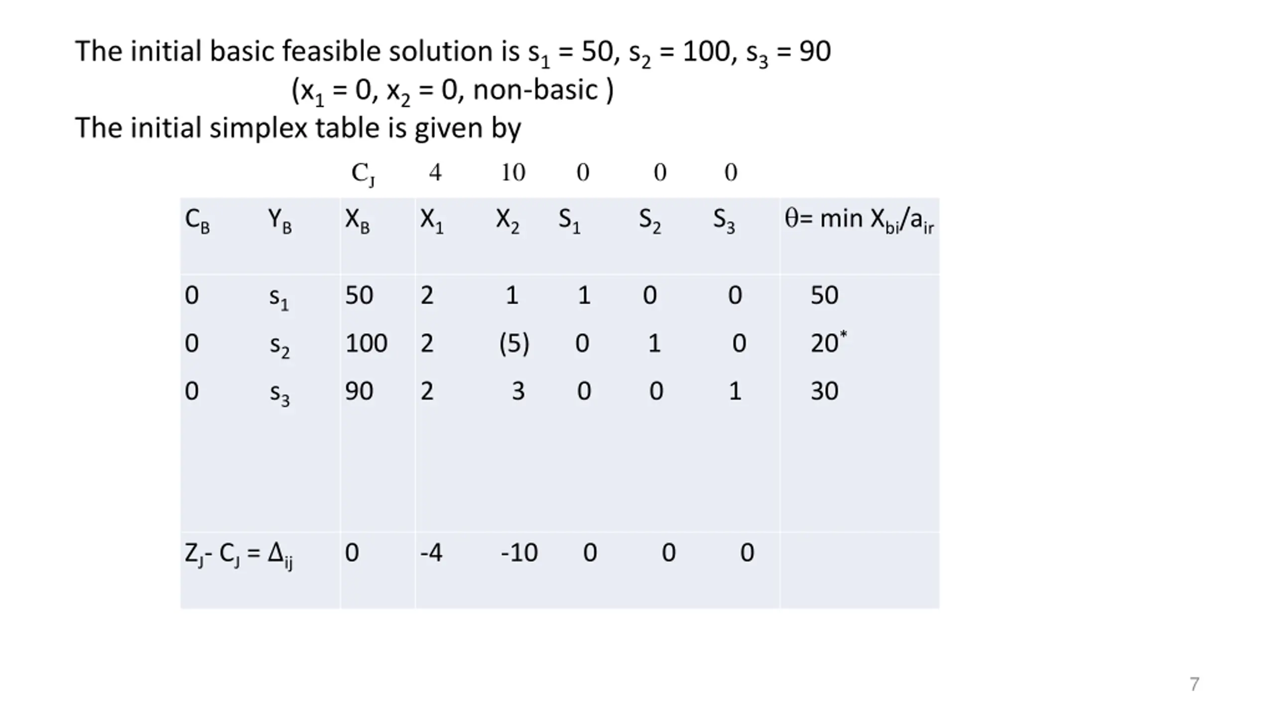 The initial basic feasible solution is s1= 50, s2= 100, s3= 90 (x1= 0, x2= 0, non-basic ) The initial simplex table is given by CJ 4 10 0 0 0 = min Xbi/air CB YB XB X1 X2 S1 S2 S3 0 s1 50 2 1 1 0 0 50 20* 0 s2 100 2 (5) 0 1 0 0 s3 90 2 3 0 0 1 30 ZJ- CJ= ij 0 -4 -10 0 0 0 7