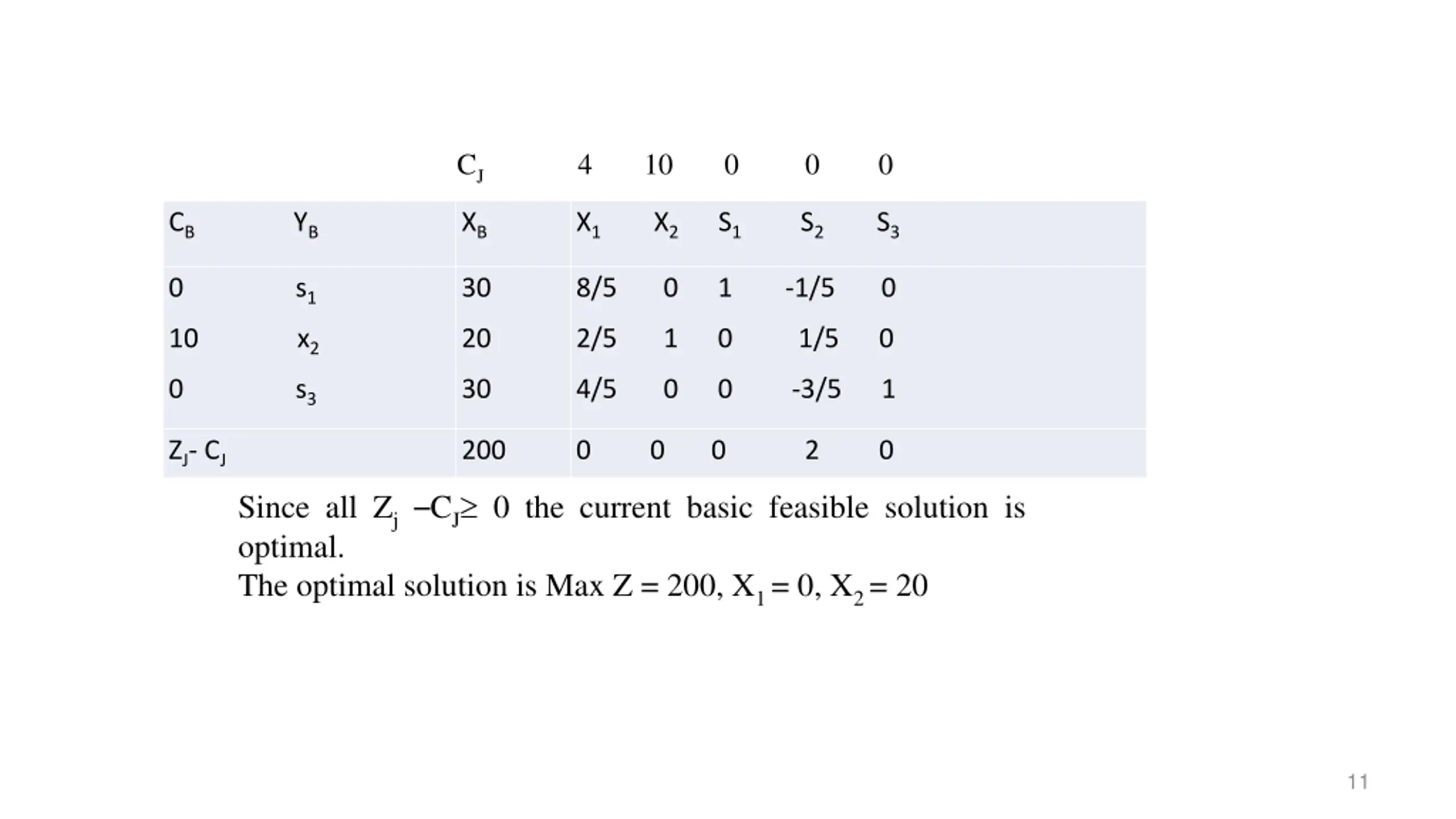 CJ 4 10 0 0 0 CB YB XB X1 X2 S1 S2 S3 0 s1 30 8/5 0 1 -1/5 0 10 x2 20 2/5 1 0 1/5 0 0 s3 30 4/5 0 0 -3/5 1 ZJ- CJ 200 0 0 0 2 0 Since all Zj CJ 0 the current basic feasible solution is optimal. The optimal solution is Max Z = 200, X1= 0, X2= 20 11