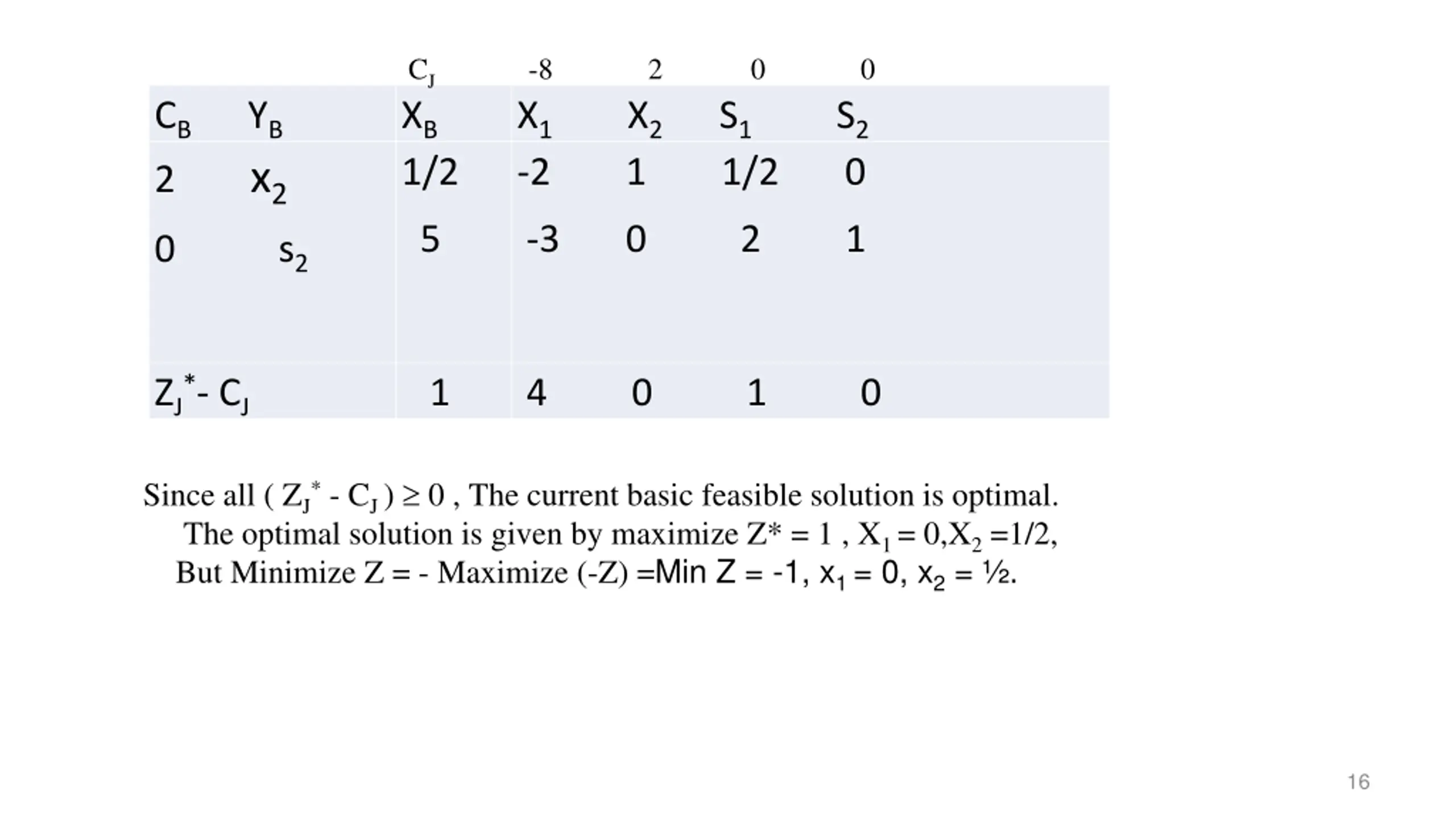 CJ -8 2 0 0 CB 2 YB x2 XB 1/2 X1 -2 X2 1 S1 1/2 S2 0 5 -3 0 2 1 0 s2 ZJ*- CJ 1 4 0 1 0 Since all ( ZJ*- CJ ) 0 , The current basic feasible solution is optimal. The optimal solution is given by maximize Z* = 1 , X1 = 0,X2=1/2, But Minimize Z = - Maximize (-Z) =Min Z = -1, x1 = 0, x2= . 16