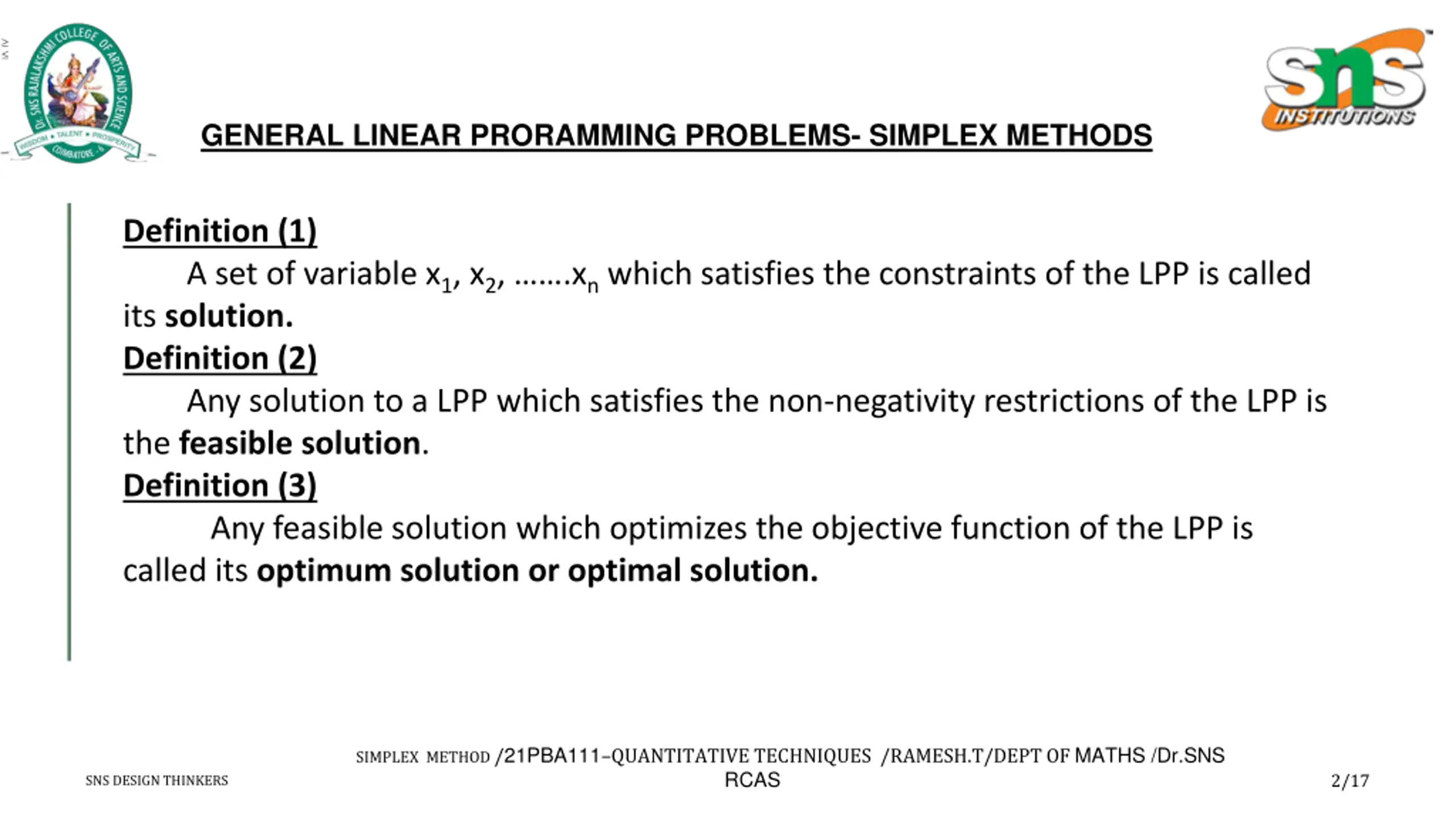 GENERAL LINEAR PRORAMMING PROBLEMS- SIMPLEX METHODS Definition (1) A set of variable x1, x2, .xnwhich satisfies the constraints of the LPP is called its solution. Definition (2) Any solution to a LPP which satisfies the non-negativity restrictions of the LPP is the feasible solution. Definition (3) Any feasible solution which optimizes the objective function of the LPP is called its optimum solution or optimal solution. SIMPLEX METHOD /21PBA111 QUANTITATIVE TECHNIQUES /RAMESH.T/DEPT OF MATHS /Dr.SNS RCAS 2/17 SNS DESIGN THINKERS