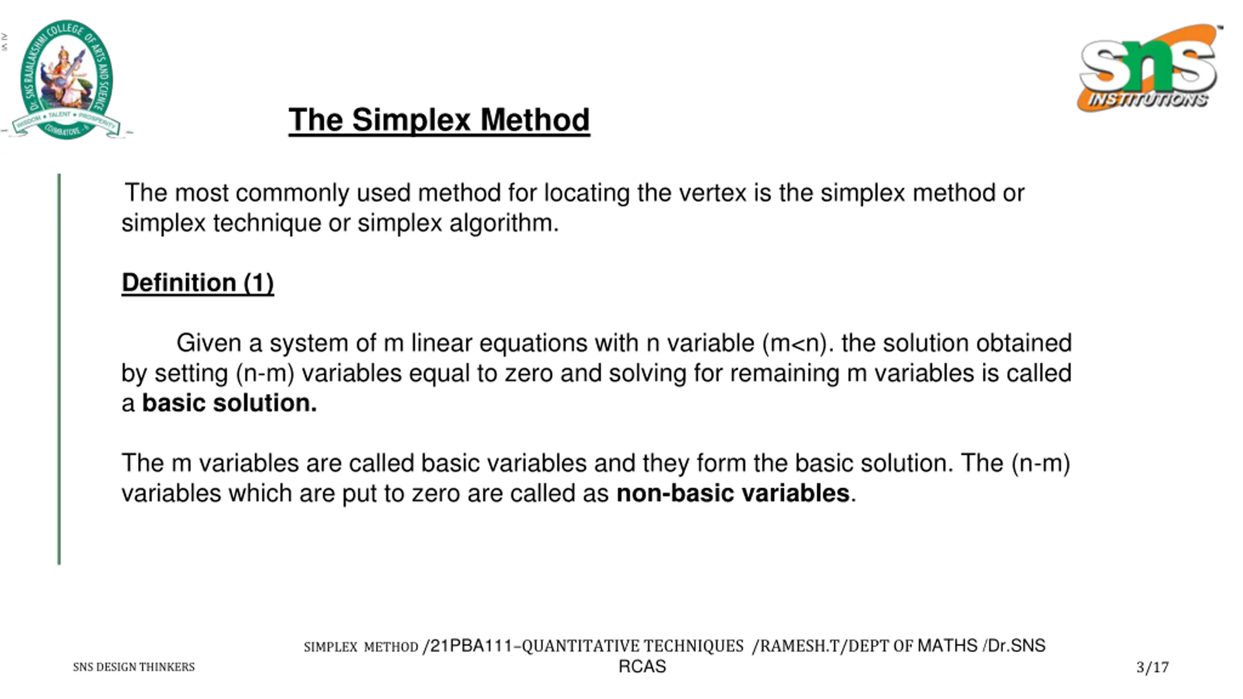 The Simplex Method The most commonly used method for locating the vertex is the simplex method or simplex technique or simplex algorithm. Definition (1) Given a system of m linear equations with n variable (m<n). the solution obtained by setting (n-m) variables equal to zero and solving for remaining m variables is called a basic solution. The m variables are called basic variables and they form the basic solution. The (n-m) variables which are put to zero are called as non-basic variables. SIMPLEX METHOD /21PBA111 QUANTITATIVE TECHNIQUES /RAMESH.T/DEPT OF MATHS /Dr.SNS RCAS 3/17 SNS DESIGN THINKERS