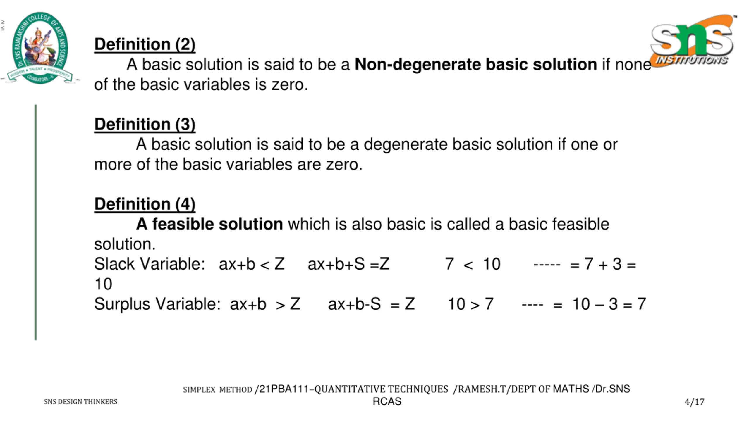 Definition (2) A basic solution is said to be a Non-degenerate basic solution if none of the basic variables is zero. Definition (3) A basic solution is said to be a degenerate basic solution if one or more of the basic variables are zero. Definition (4) A feasible solution which is also basic is called a basic feasible solution. Slack Variable: ax+b < Z ax+b+S =Z 7 < 10 ----- = 7 + 3 = 10 Surplus Variable: ax+b > Z ax+b-S = Z 10 > 7 ---- = 10 3 = 7 SIMPLEX METHOD /21PBA111 QUANTITATIVE TECHNIQUES /RAMESH.T/DEPT OF MATHS /Dr.SNS RCAS 4/17 SNS DESIGN THINKERS