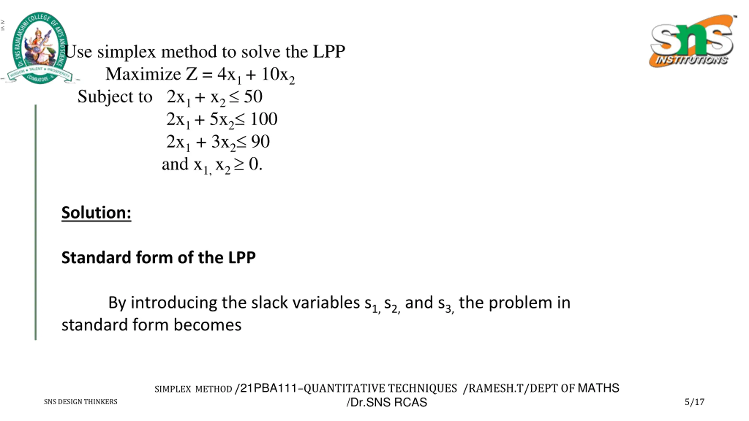 Use simplex method to solve the LPP Maximize Z = 4x1 + 10x2 Subject to 2x1 + x2 50 2x1 + 5x2 100 2x1+ 3x2 90 and x1, x2 0. Solution: Standard form of the LPP By introducing the slack variables s1, s2,and s3,the problem in standard form becomes SIMPLEX METHOD /21PBA111 QUANTITATIVE TECHNIQUES /RAMESH.T/DEPT OF MATHS /Dr.SNS RCAS 5/17 SNS DESIGN THINKERS