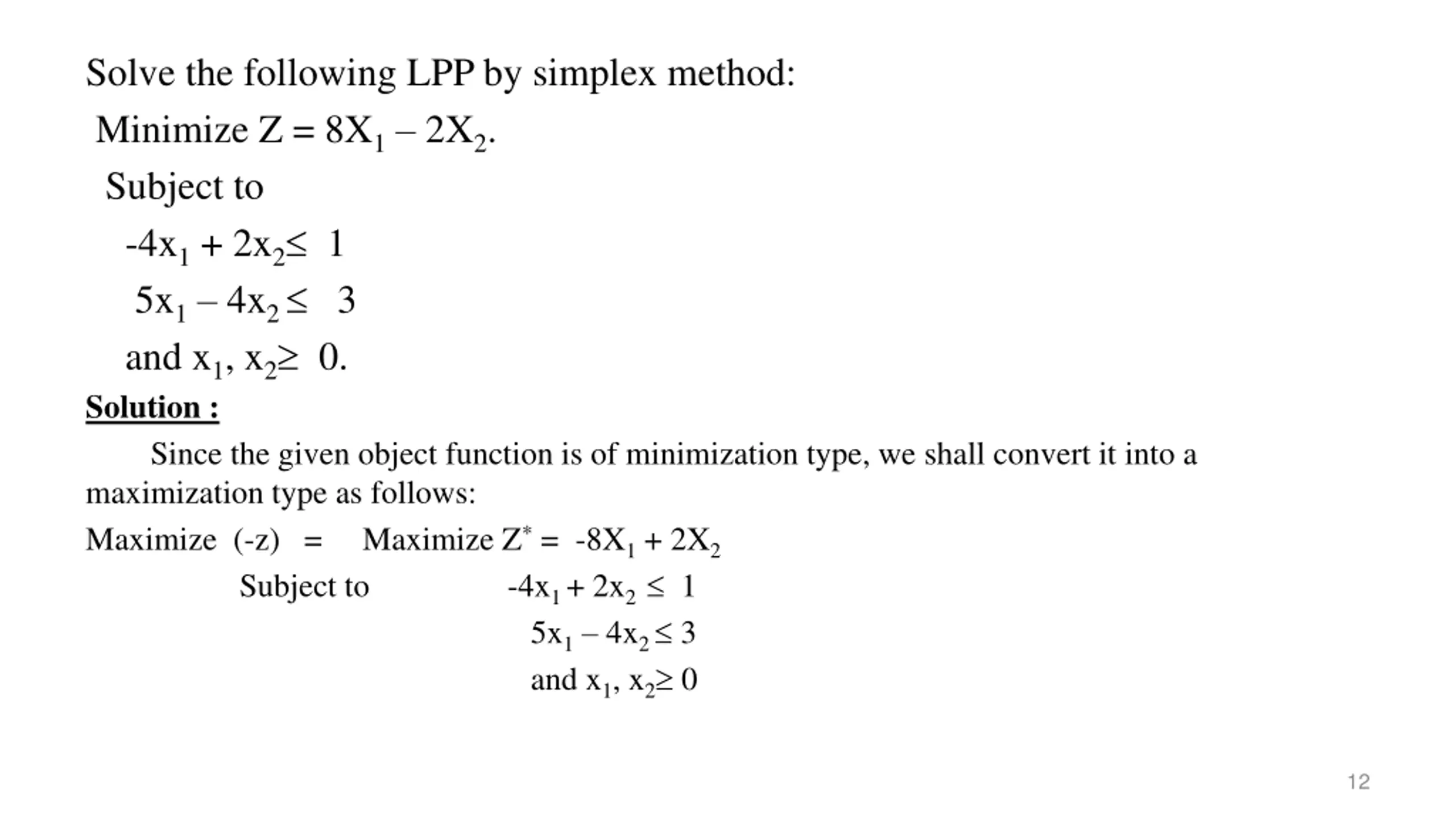 Solve the following LPP by simplex method: Minimize Z = 8X1 2X2. Subject to -4x1+ 2x2 1 5x1 4x2 3 and x1, x2 0. Solution : Since the given object function is of minimization type, we shall convert it into a maximization type as follows: Maximize (-z) = Maximize Z*= -8X1+ 2X2 Subject to -4x1 + 2x2 1 5x1 4x2 3 and x1, x2 0 12