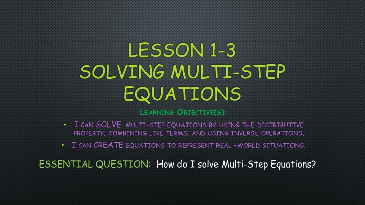 LESSON 1-3 SOLVING MULTI-STEP EQUATIONS LEARNING OBJECTIVE(S): I CAN SOLVE MULTI-STEP EQUATIONS BY USING THE DISTRIBUTIVE PROPERTY; COMBINING LIKE TERMS; AND USING INVERSE OPERATIONS. I CAN CREATE EQUATIONS TO REPRESENT REAL -WORLD SITUATIONS. ESSENTIAL QUESTION: How do I solve Multi-Step Equations?