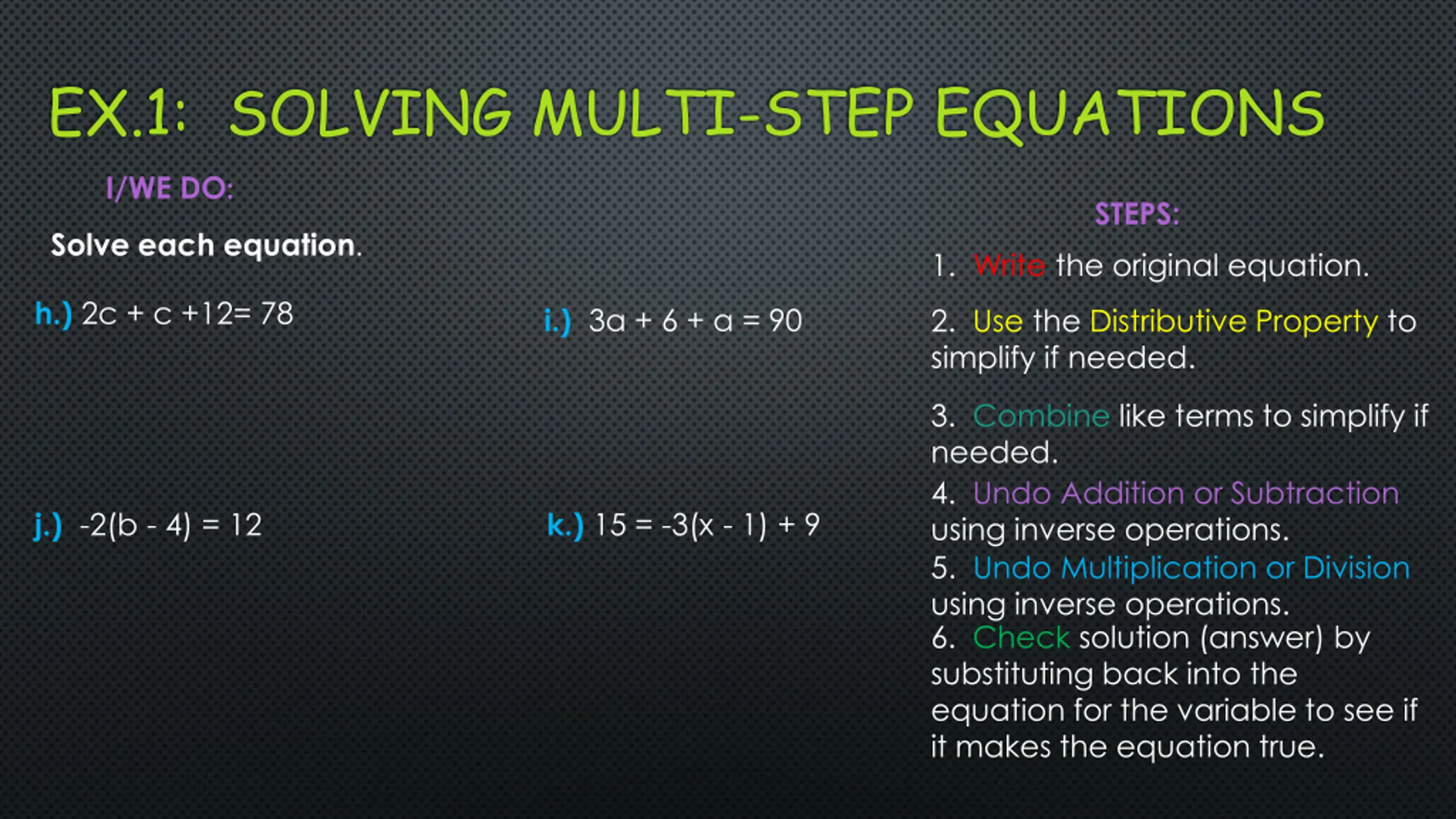 EX.1: SOLVING MULTI-STEP EQUATIONS I/WE DO: STEPS: Solve each equation. 1. Write the original equation. h.) 2c + c +12= 78 i.) 3a + 6 + a = 90 2. Use the Distributive Property to simplify if needed. 3. Combine like terms to simplify if needed. 4. Undo Addition or Subtraction using inverse operations. 5. Undo Multiplication or Division using inverse operations. 6. Check solution (answer) by substituting back into the equation for the variable to see if it makes the equation true. j.) -2(b - 4) = 12 k.) 15 = -3(x - 1) + 9