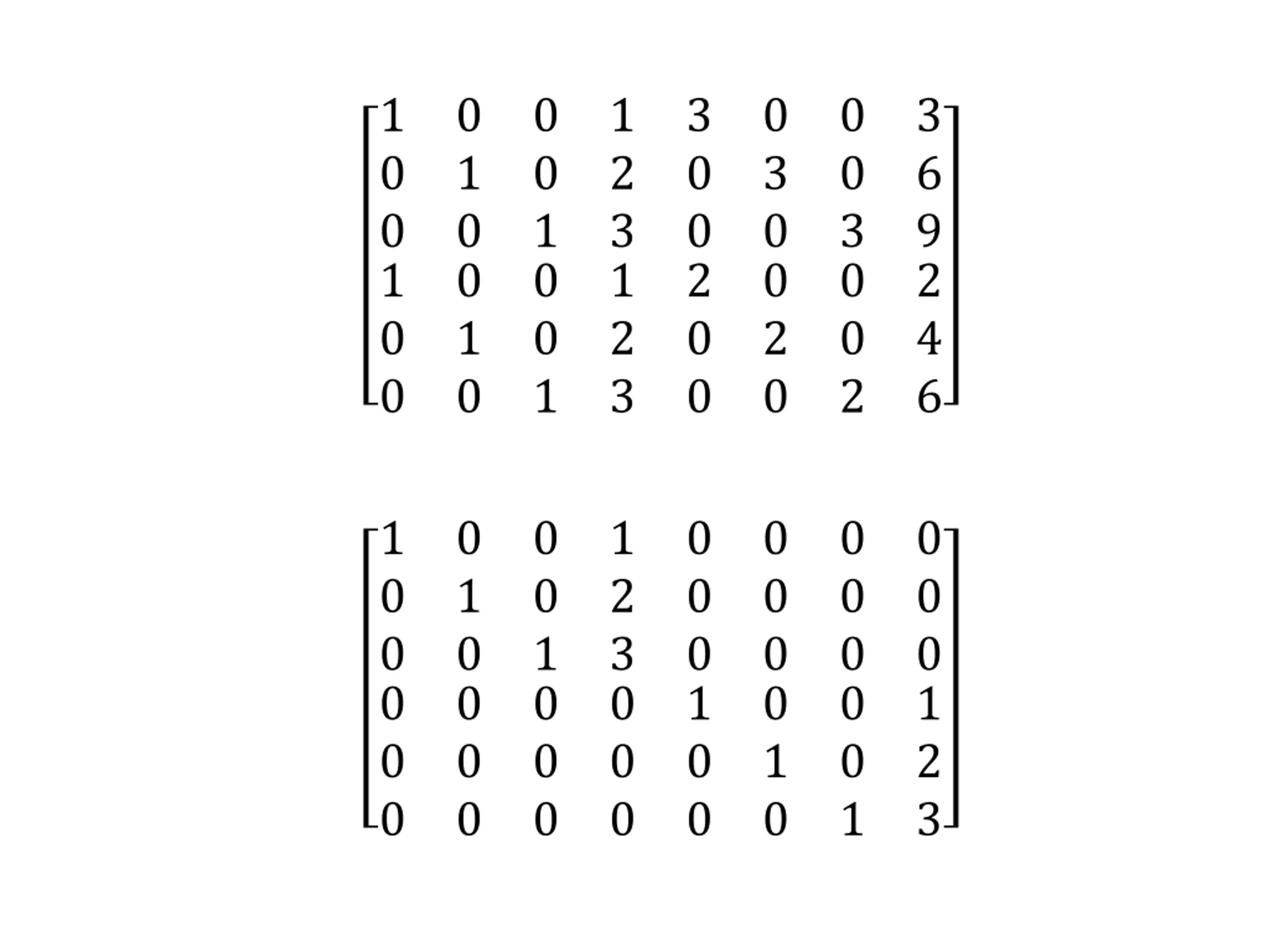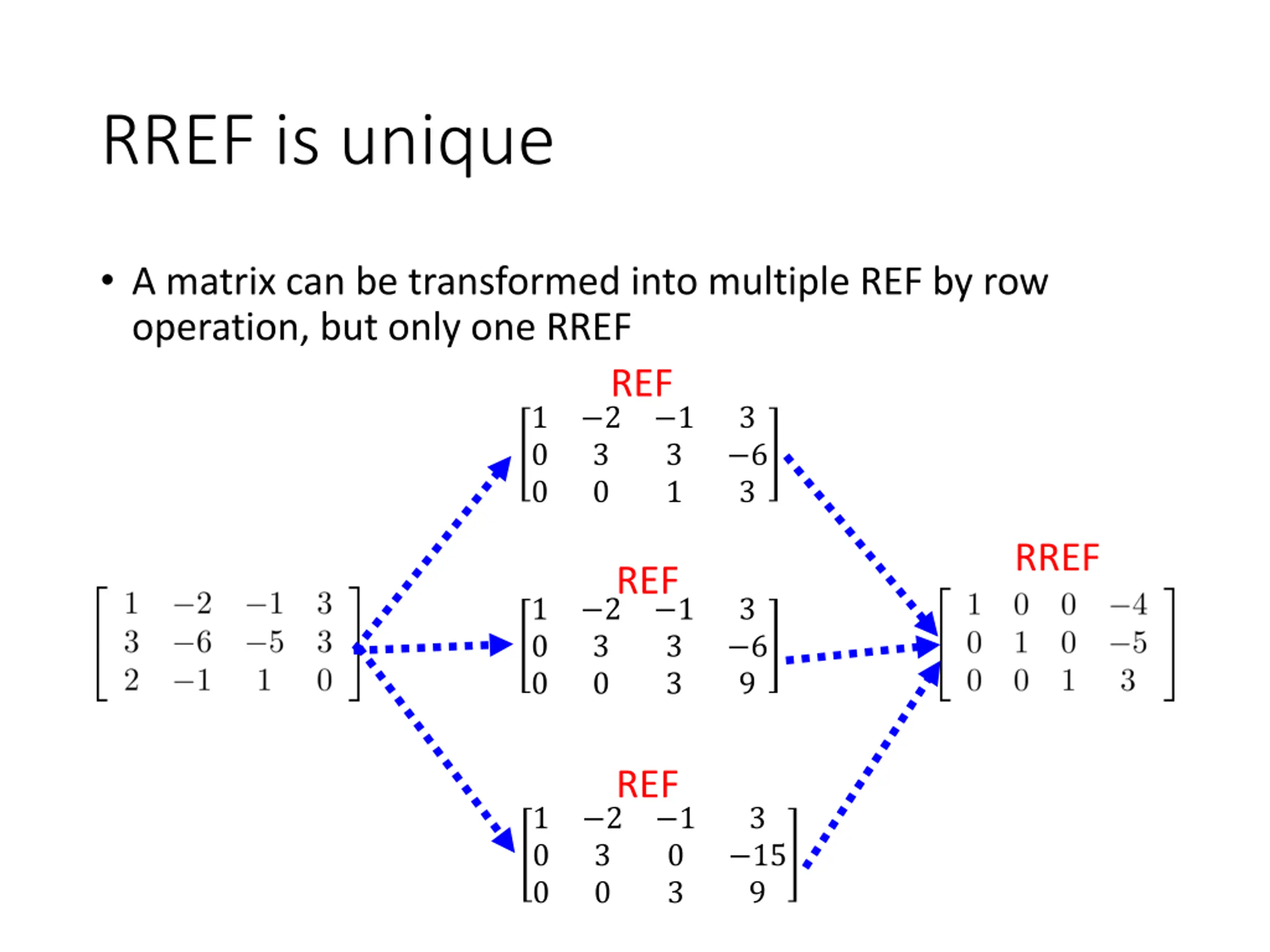 RREF is unique A matrix can be transformed into multiple REF by row operation, but only one RREF REF 2 3 0 1 0 0 1 3 1 3 6 3 RREF REF 1 0 0 2 3 0 1 3 3 3 6 9 REF 1 0 0 2 3 0 1 0 3 3 15 9