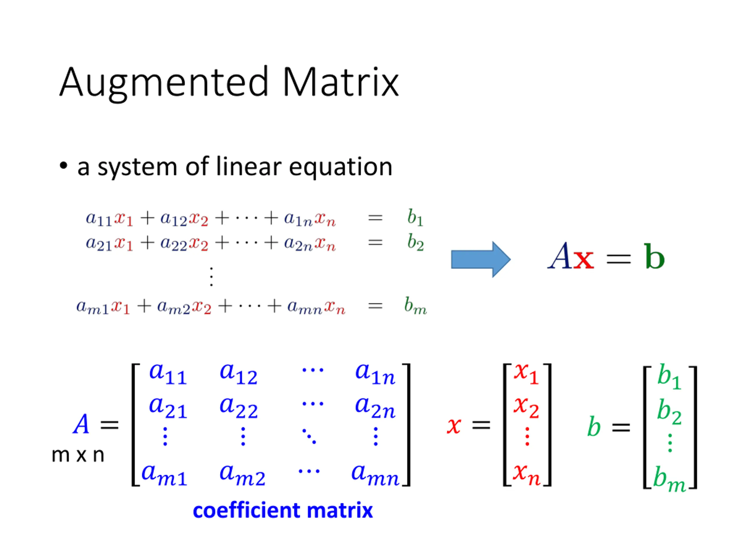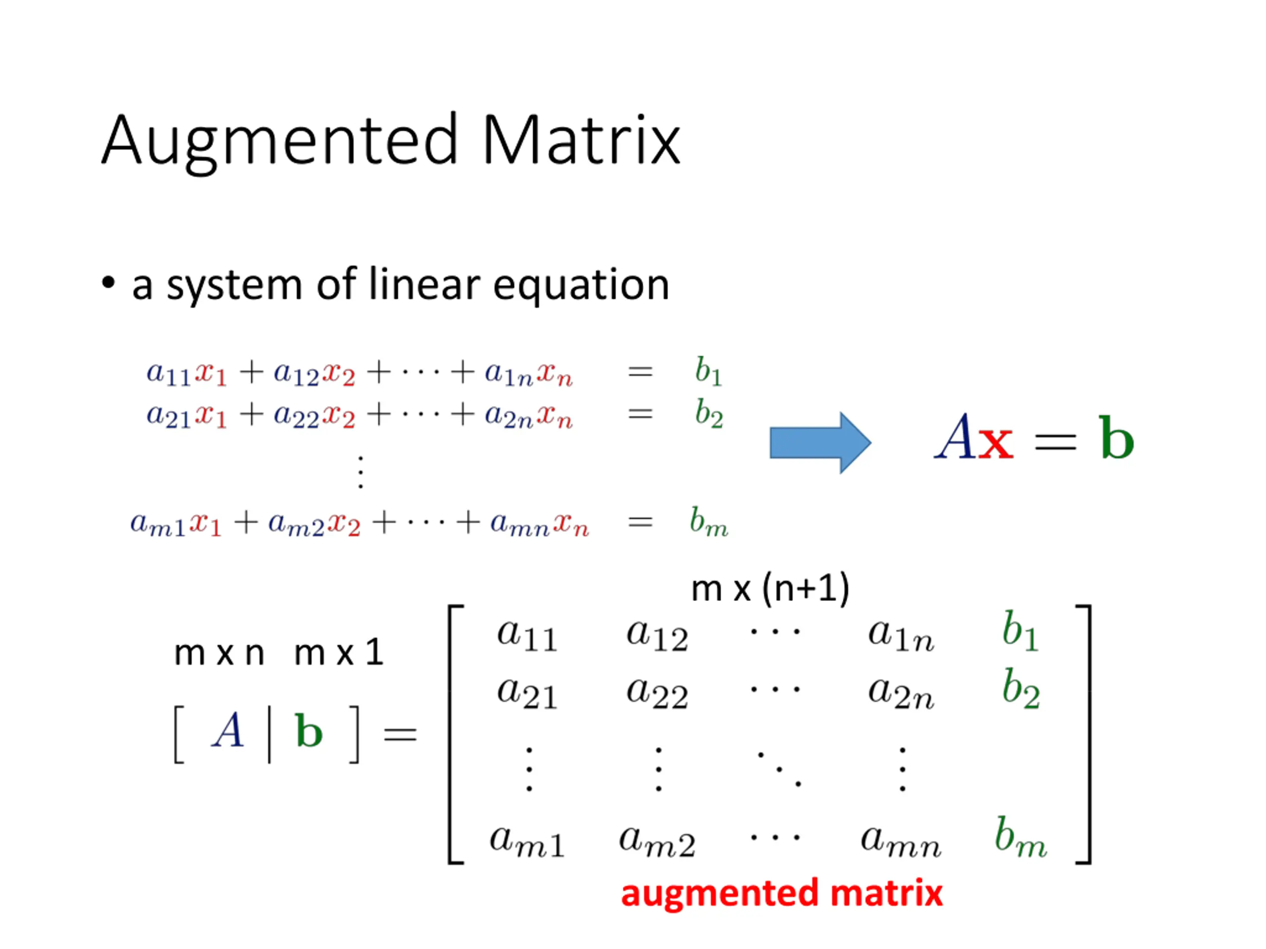 Augmented Matrix a system of linear equation m x (n+1) m x n m x 1 augmented matrix