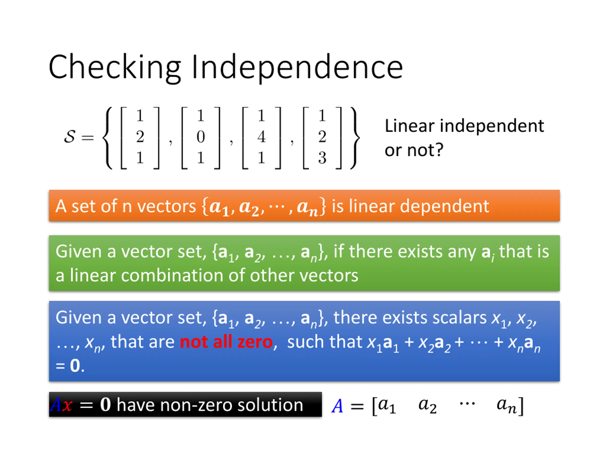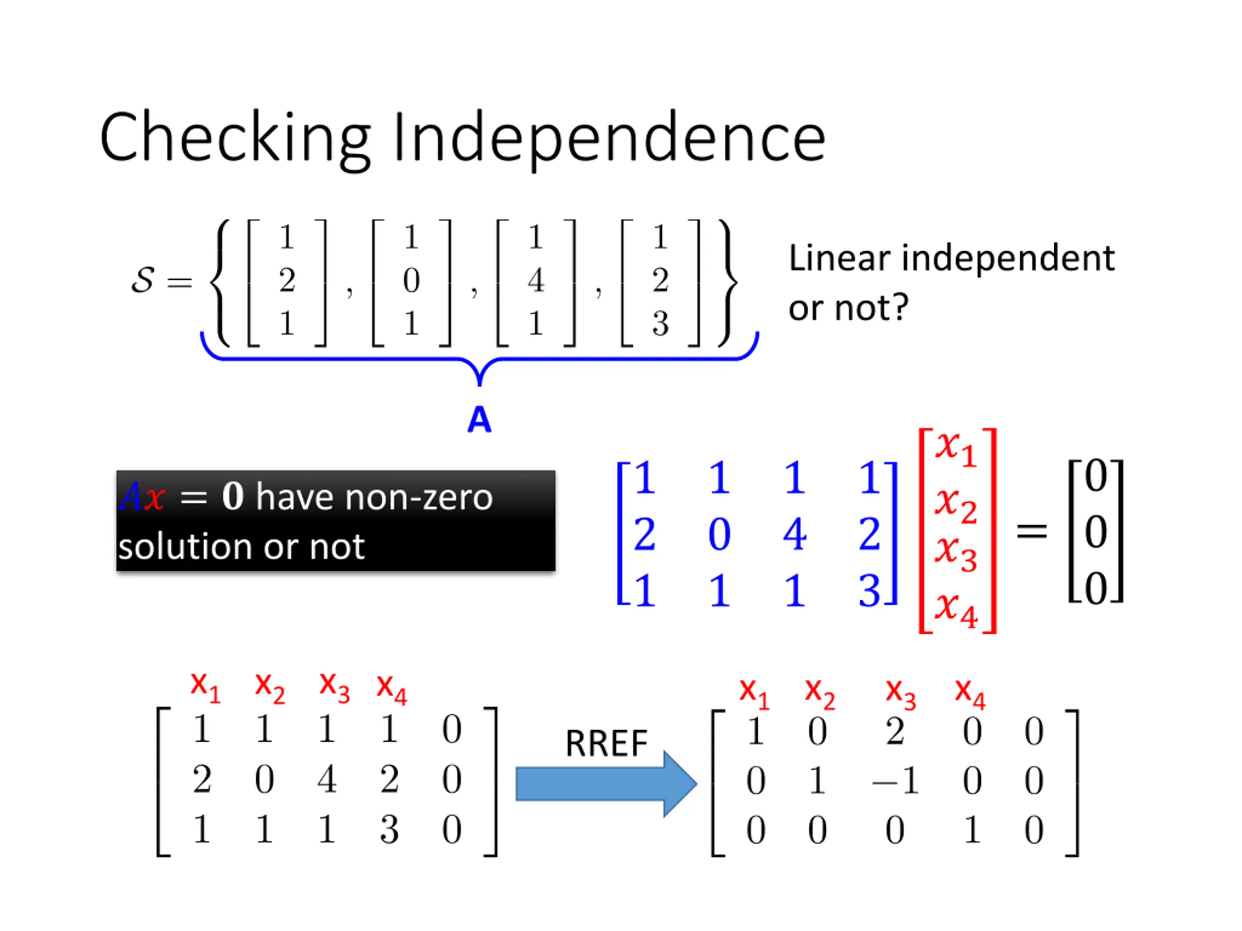 Checking Independence Linear independent or not? A ?1 ?2 ?3 ?4 0 0 0 1 2 1 1 0 1 1 4 1 1 2 3 ?? = ?have non-zero solution or not = x1 x2x3 x4 x1 x2 x4 x3 RREF