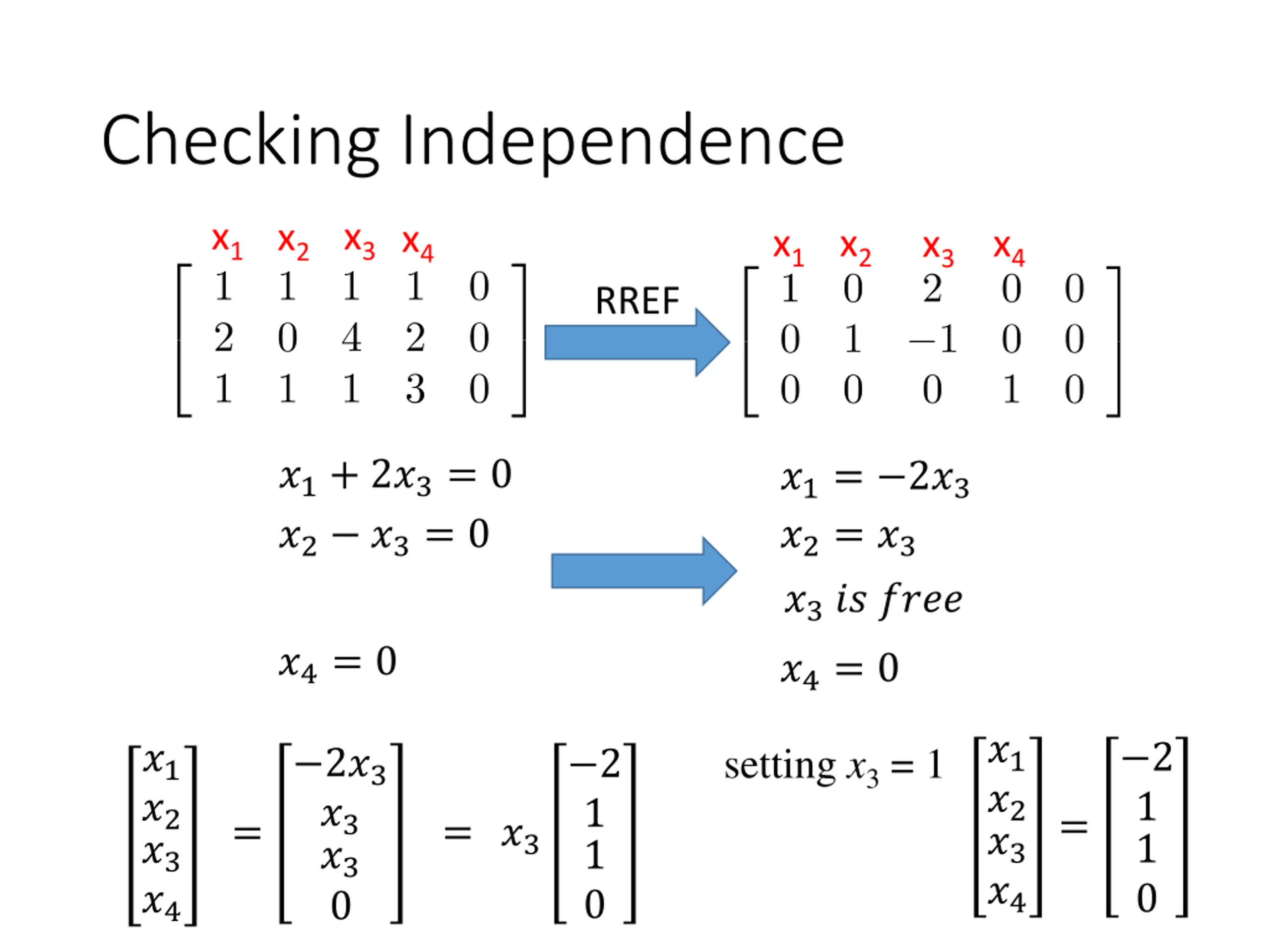 Checking Independence x1 x2x3 x4 x1 x2 x4 x3 RREF ?1+ 2?3= 0 ?2 ?3= 0 ?1= 2?3 ?2= ?3 ?3?? ???? ?4= 0 ?4= 0 ?1 ?2 ?3 ?4 2 1 1 0 ?1 ?2 ?3 ?4 setting x3= 1 2?3 ?3 ?3 0 2 1 1 0 = = ?3 =