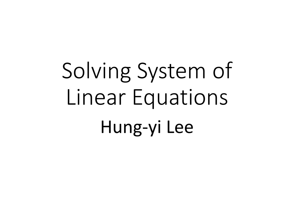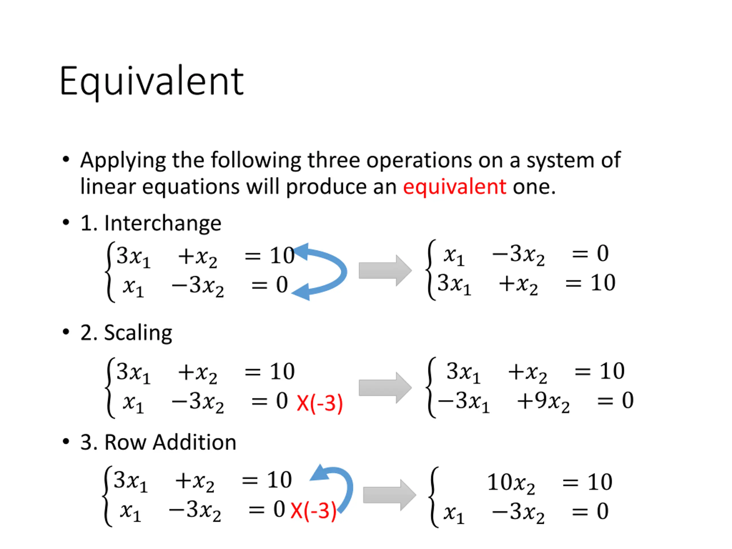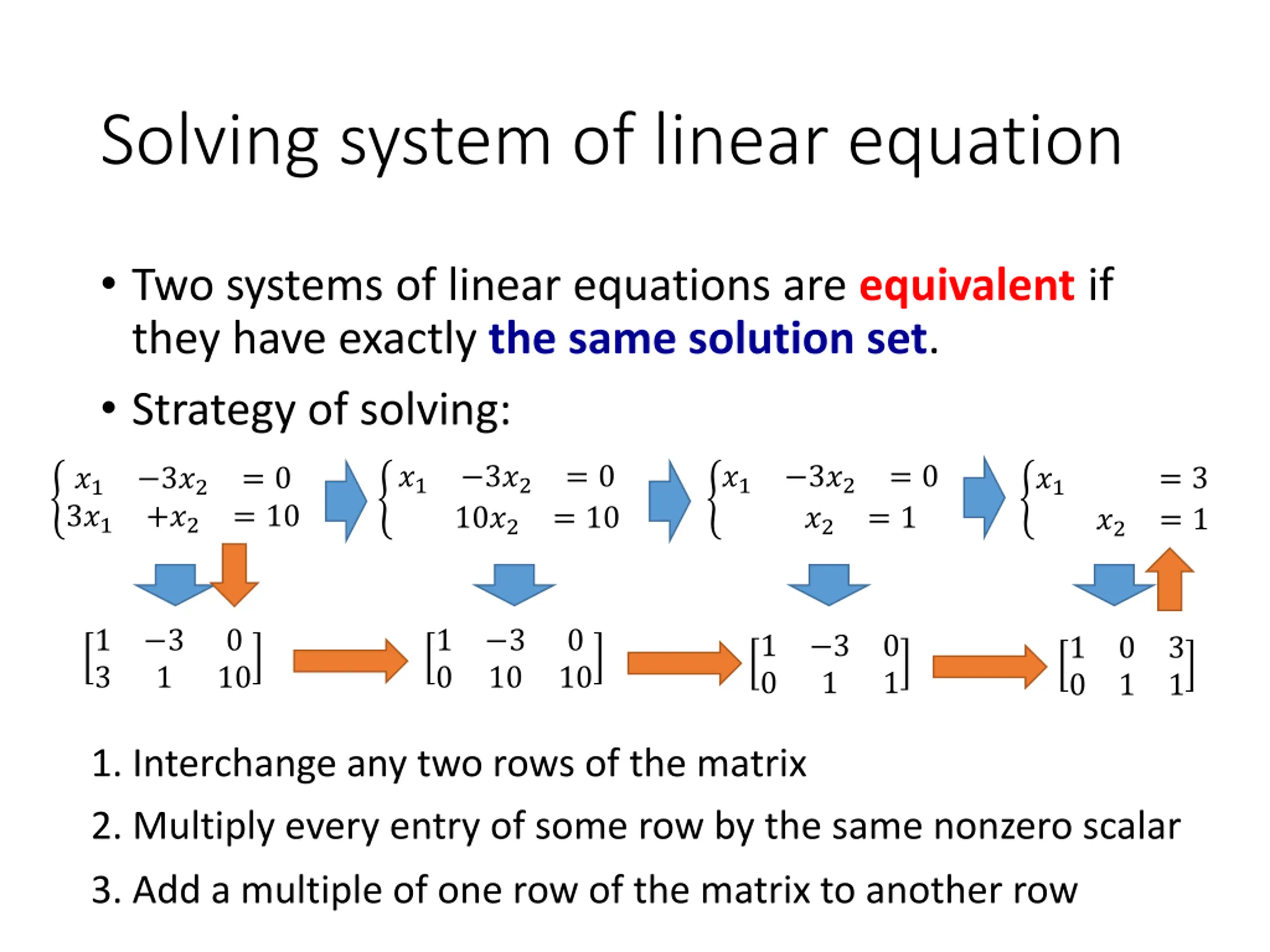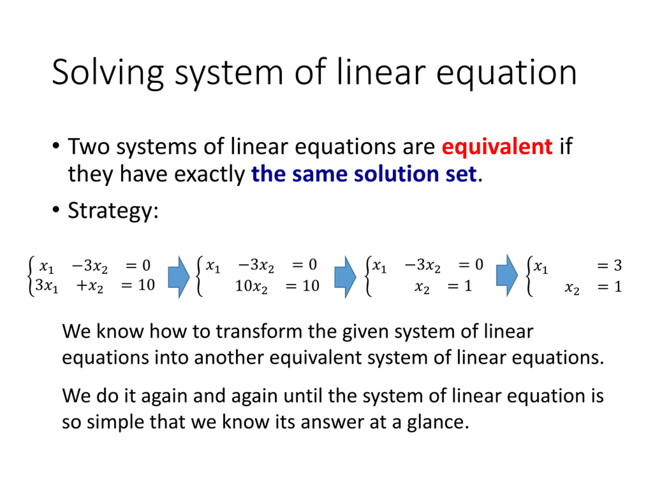 Solving system of linear equation Two systems of linear equations are equivalent if they have exactly the same solution set. Strategy: ?1 3?2 10?2 = 0 = 10 ?1 3?2 ?2 = 0 = 1 ?1 3?1 3?2 +?2 = 0 = 10 ?1 = 3 = 1 ?2 We know how to transform the given system of linear equations into another equivalent system of linear equations. We do it again and again until the system of linear equation is so simple that we know its answer at a glance.