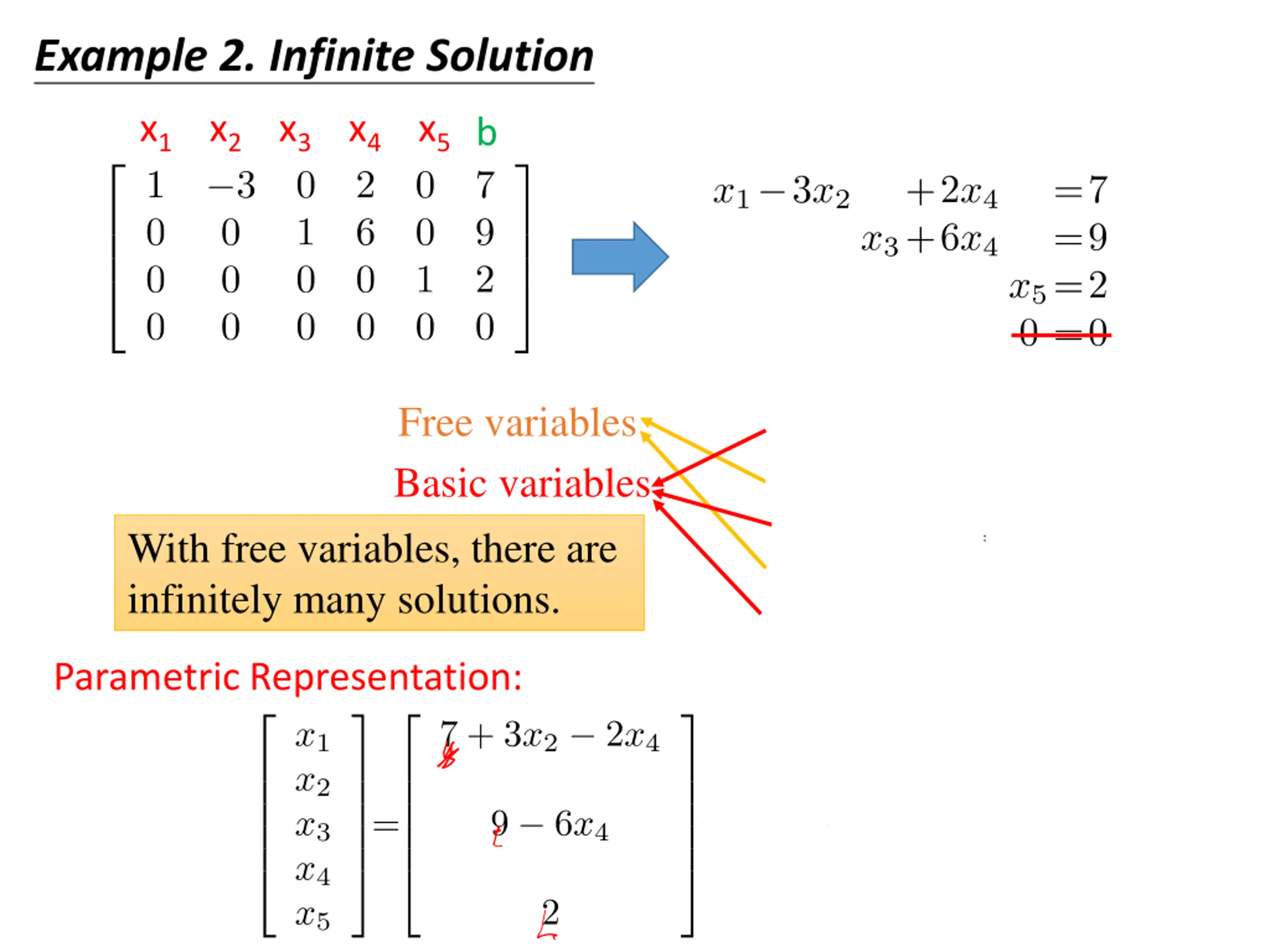 Example 2. Infinite Solution x1 x2 x3 x4 x5 b Free variables Basic variables With free variables, there are infinitely many solutions. Parametric Representation: