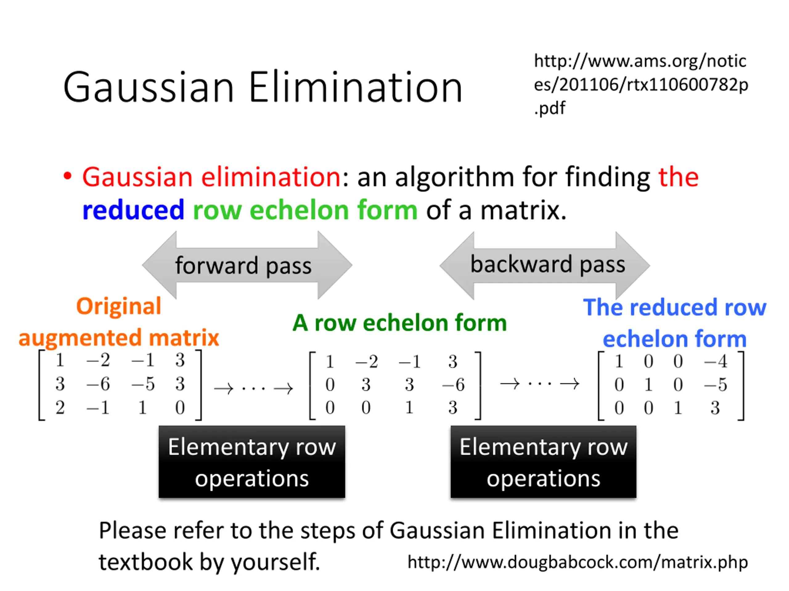 http://www.ams.org/notic es/201106/rtx110600782p .pdf Gaussian Elimination Gaussian elimination: an algorithm for finding the reduced row echelon form of a matrix. backward pass forward pass Original The reduced row echelon form A row echelon form augmented matrix Elementary row operations Elementary row operations Please refer to the steps of Gaussian Elimination in the textbook by yourself. http://www.dougbabcock.com/matrix.php
