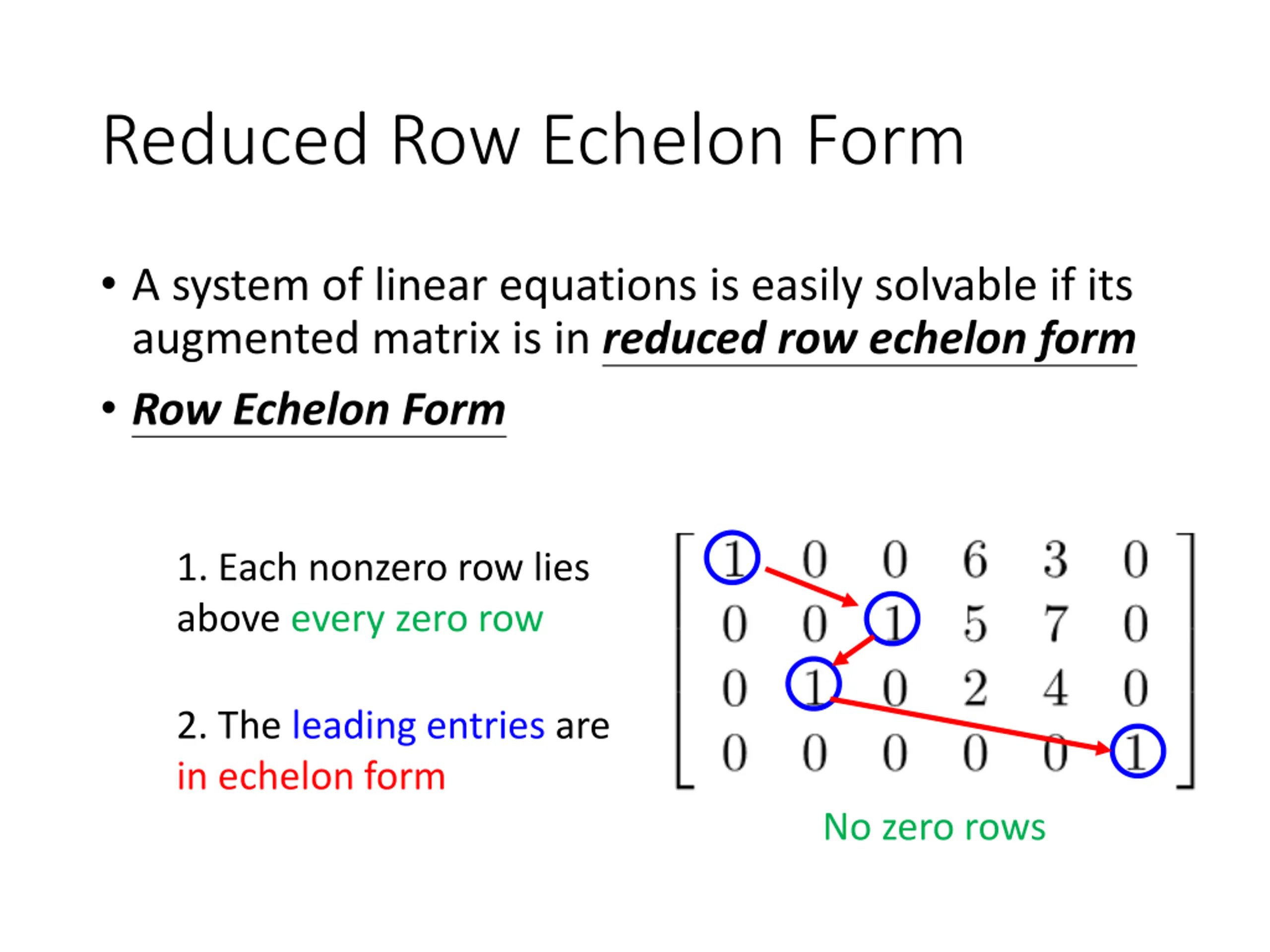 Reduced Row Echelon Form A system of linear equations is easily solvable if its augmented matrix is in reduced row echelon form Row Echelon Form 1. Each nonzero row lies above every zero row 2. The leading entries are in echelon form No zero rows