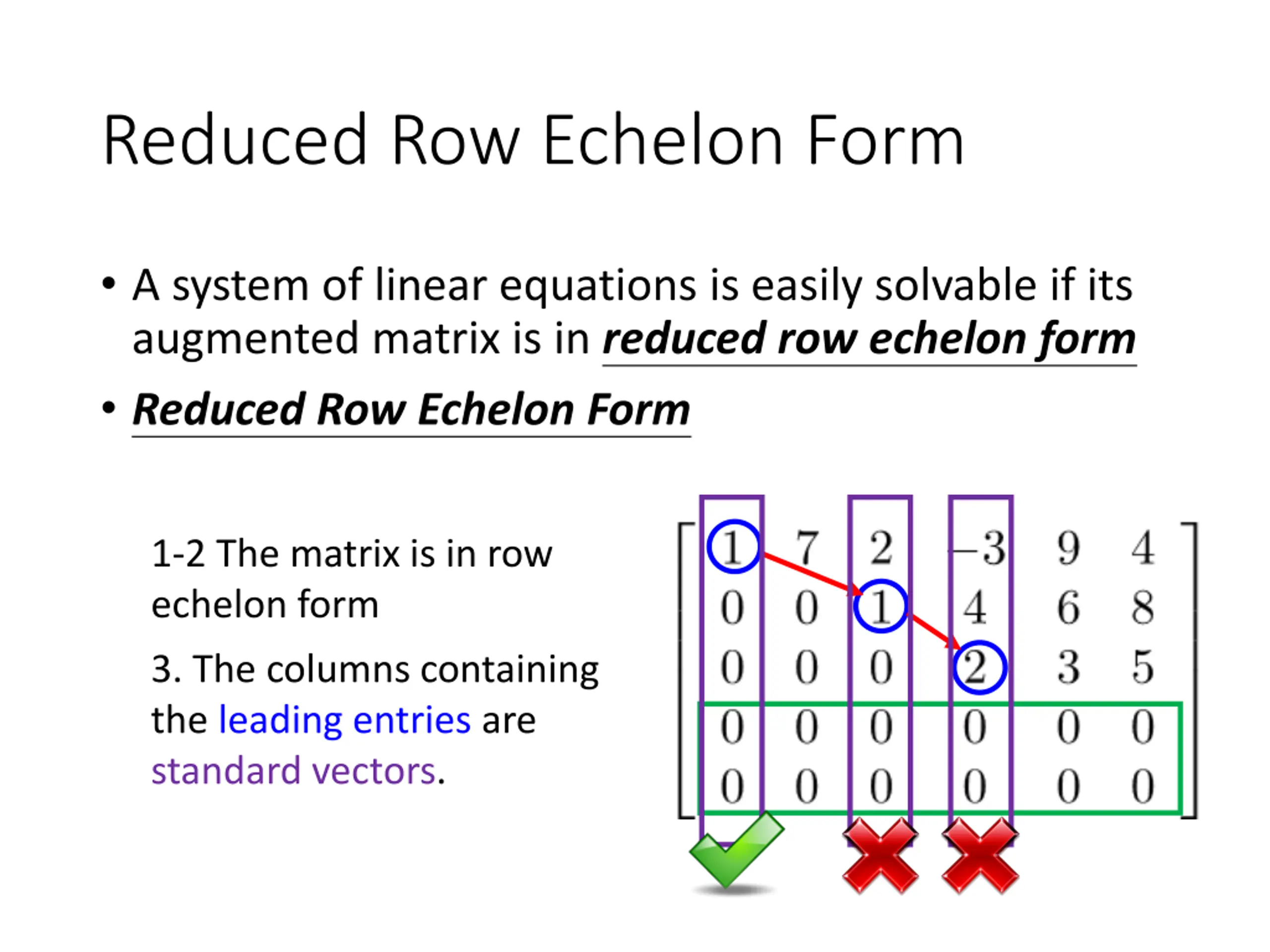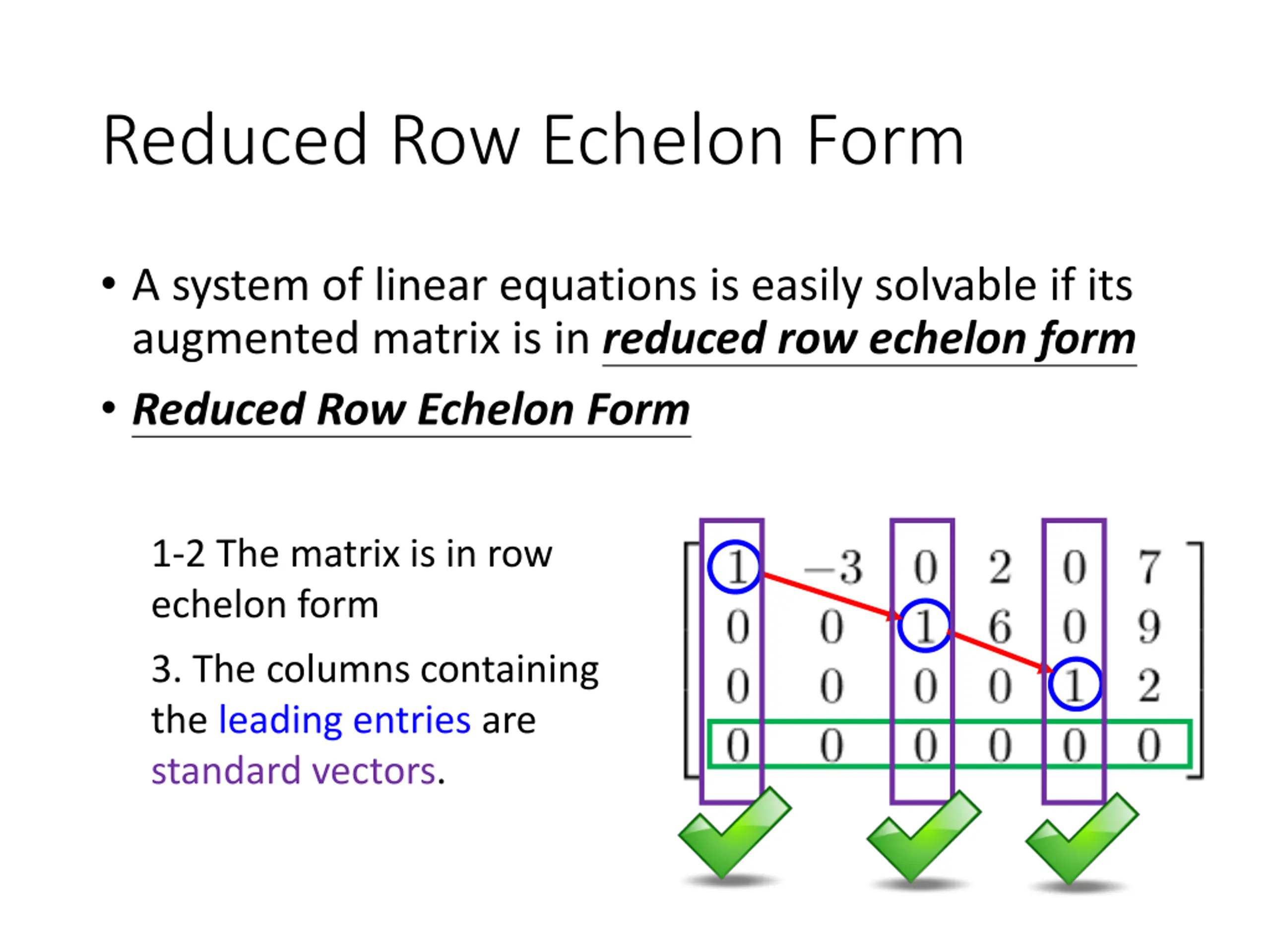 Reduced Row Echelon Form A system of linear equations is easily solvable if its augmented matrix is in reduced row echelon form Reduced Row Echelon Form 1-2 The matrix is in row echelon form 3. The columns containing the leading entries are standard vectors.