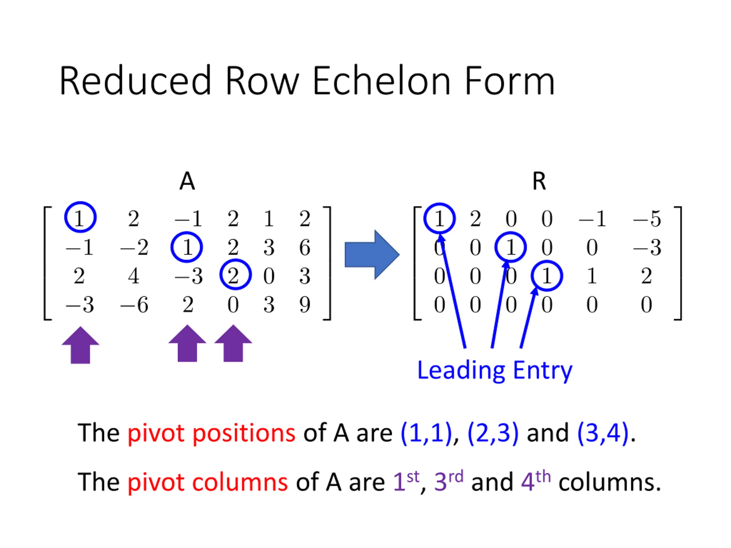 Reduced Row Echelon Form A R Leading Entry The pivot positions of A are (1,1), (2,3) and (3,4). The pivot columns of A are 1st, 3rdand 4thcolumns.